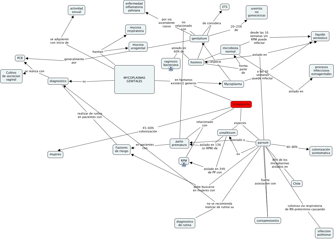 Este Cmap, tiene información relacionada con: mycoplasmas genitales, parvum 40-80% colonización asintomatica, MYCOPLASMAS GENITALES hanitan mucosa respiratoria, Ureaplasma 45-60% colonización mujeres, genitalium no relacionado con parto prematuro, MYCOPLASMAS GENITALES su diagnostico, microbiota normal aislado en procesos infecciosos extragenitales, genitalium 20-25% de uretritis no gonococicas, urealiticum aislado en 13% (si RPM) de parto prematuro, hominis forma parte de microbiota normal, hominis aislado en 60% de vaginosis bacteriana, Ureaplasma relacionado con RPM, diagnostico se realiza con PCR, parvum fuerte asociacion con corioamnionitis, parvum asociado a parto prematuro, parvum debe buscarse en mujeres con Factores de riesgo, MYCOPLASMAS GENITALES en humanos existen 2 generos Ureaplasma, urealiticum aislado en 34% de PP con RPM, Ureaplasma especies parvum, diagnostico realizar de rutina en pacientes con Factores de riesgo, Ureaplasma especies urealiticum