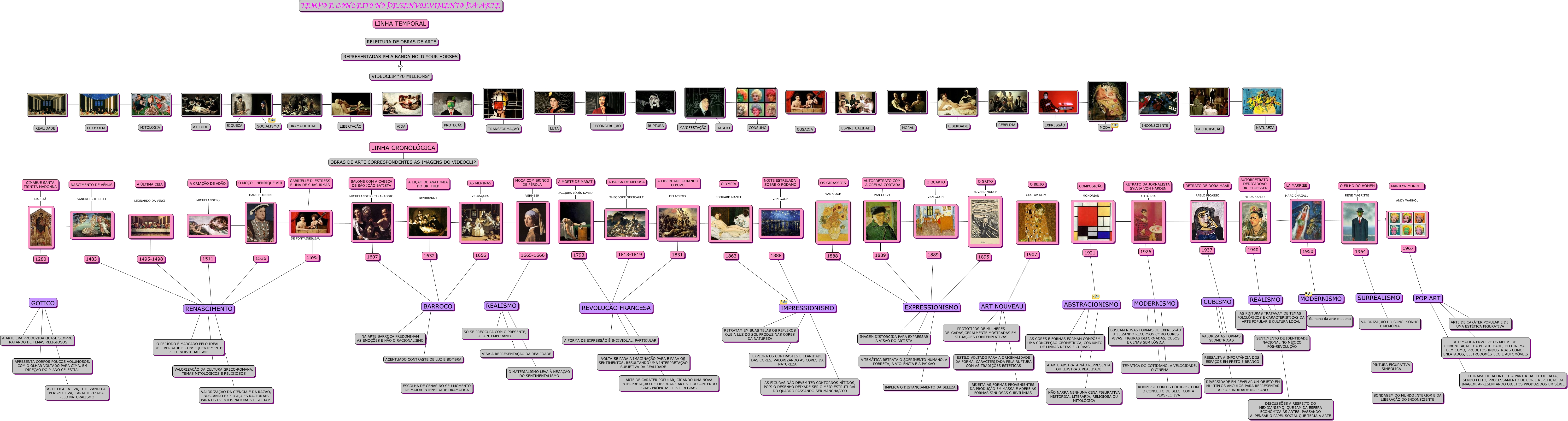 Esse mapa conceitual, produzido no IHMC CmapTools, tem a informação relacionada a: Tempo e conceito no desenvolvimento da Arte, a partir do Vídeo 70 Million, ????, REALIDADE ????, ????, 1511 ???? RENASCIMENTO, ????, O PERÍODO É MARCADO PELO IDEAL DE LIBERDADE E CONSEQUENTEMENTE PELO INDIVIDUALISMO ???? RENASCIMENTO, ???? 1536, HÁBITO ????, PROTEÇÃO ????, RECONSTRUÇÃO ????, ART NOUVEAU ???? REJEITA AS FORMAS PROVENIENTES DA PRODUÇÃO EM MASSA E ADERE AS FORMAS SINUOSAS CURVILÍNIAS, SÓ SE PREOCUPA COM O PRESENTE, O CONTEMPORÂNEO ???? REALISMO, ????, OLYMPIA EDOUARD MANET, ????, LINHA CRONOLÓGICA ???? OBRAS DE ARTE CORRESPONDENTES AS IMAGENS DO VIDEOCLIP, 1950 ???? MODERNISMO, IMAGEM DISTORCIDA PARA EXPRESSAR A VISÃO DO ARTISTA ???? EXPRESSIONISMO, 1889 ???? EXPRESSIONISMO, LIBERDADE ????