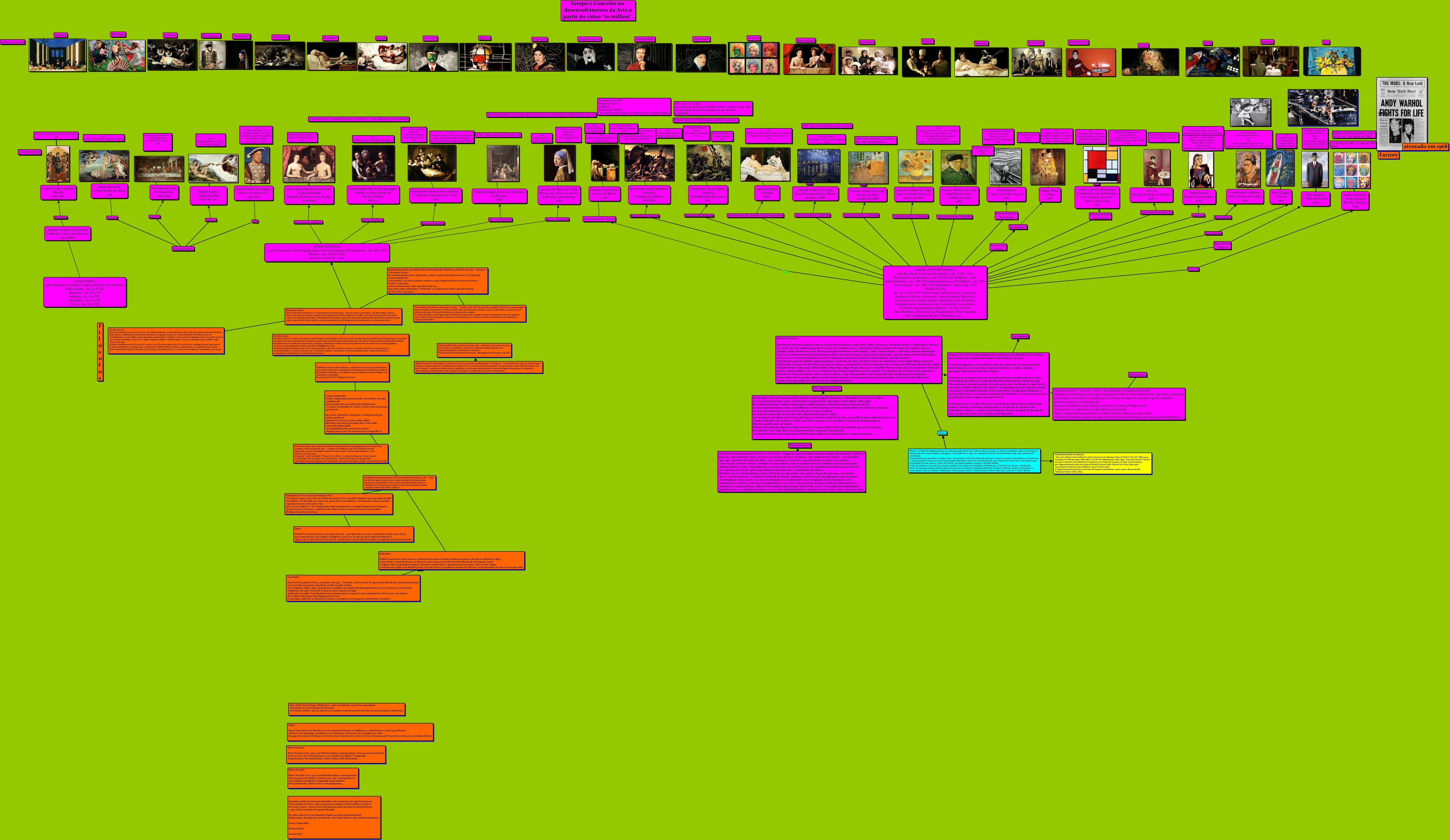 Esse mapa conceitual, produzido no IHMC CmapTools, tem a informação relacionada a: Tempo e conceito no desenvolvimento da Arte,a partir do vídeo 70 million, Sandro Botticelli O Nascimento de Vênus 1483 ????, IDADE CONTEMPORÂNEA 1789 (Revolução Francesa) Neoclassico - séc. XVIII - 1.800 Romantismo ou Neogótico - séc. XVIII a XIX .Realismo - 1.830 Impressionismo - séc. XIX. Pós-Impressionismo ou Pontilhismo - séc. XIX Art Nouveaux - séc. XIX a XX. Simbolismo - final do séc. XIX IDADE ATUAL séc. XX e início XXI Primitivismo, Expressionismo, Fauvismo, Ingênuos, Cubismo, Futurismo, Abstracionismo, Metafísica Construtivismo, Suprematismo, Dadaísmo, Arte Fantástica Neoplasticismo, Realismo Social, Surrealismo, Concretismo Tachismo, Expressionismo abstrato, Op Art, Pop Art, Hiper-Realismo, Arte Cinética, Figurativismo, Nova Figuração Arte Computacional, Arte Sibernética, etc. ... Surrealismo Marc Chagall A Noiva 1950, Jan van der Meer Van Delft Moça com brinco de pérola, ou Mulher com turbante 1665 ????, Marc Chagall A Noiva 1950 ????, Michelangelo Merisi da Caravaggio Salomé recebe a cabeça de São João Batista 1607/10 ????, IDADE CONTEMPORÂNEA 1789 (Revolução Francesa) Neoclassico - séc. XVIII - 1.800 Romantismo ou Neogótico - séc. XVIII a XIX .Realismo - 1.830 Impressionismo - séc. XIX. Pós-Impressionismo ou Pontilhismo - séc. XIX Art Nouveaux - séc. XIX a XX. Simbolismo - final do séc. XIX IDADE ATUAL séc. XX e início XXI Primitivismo, Expressionismo, Fauvismo, Ingênuos, Cubismo, Futurismo, Abstracionismo, Metafísica Construtivismo, Suprematismo, Dadaísmo, Arte Fantástica Neoplasticismo, Realismo Social, Surrealismo, Concretismo Tachismo, Expressionismo abstrato, Op Art, Pop Art, Hiper-Realismo, Arte Cinética, Figurativismo, Nova Figuração Arte Computacional, Arte Sibernética, etc. ... ???? neoclassicismo- frança, IDADE CONTEMPORÂNEA 1789 (Revolução Francesa) Neoclassico - séc. XVIII - 1.800 Romantismo ou Neogótico - séc. XVIII a XIX .Realismo - 1.830 Impressionismo - séc. XIX. Pós-Impressionismo ou Pontilhismo - séc. XIX Art Nouveaux - séc. XIX a XX. Simbolismo - final do séc. XIX IDADE ATUAL séc. XX e início XXI Primitivismo, Expressionismo, Fauvismo, Ingênuos, Cubismo, Futurismo, Abstracionismo, Metafísica Construtivismo, Suprematismo, Dadaísmo, Arte Fantástica Neoplasticismo, Realismo Social, Surrealismo, Concretismo Tachismo, Expressionismo abstrato, Op Art, Pop Art, Hiper-Realismo, Arte Cinética, Figurativismo, Nova Figuração Arte Computacional, Arte Sibernética, etc. ... Romantismo Francês Jean-Louis-André-Théodore Géricault A Jangada da Medusa, 1818-1819, Desiderius Erasmus Roterodamus, conhecido como Erasmo de Rotterdam ou Erasmo de Roterdã, (nascido provavelmente a 27 de Outubro de 1466 em Rotterdam e falecido a 12 de Julho de 1536 em Basiléia) foi um teólogo e um humanista neerlandês. Seu principal livro foi "Elogio da Loucura" ???? Giordano Bruno Giordano Bruno é a maior expressão do imanentismo renascentista. Nasceu em Nola em 1548, entrou na Ordem dos Dominicanos aos 15 anos. Acusado de heresia e afastado de sua ordem, iniciou uma vida giróvaga através da Europa. De volta a Veneza, foi processado pelo tribunal da Inquisição e reconheceu os seus erros. Entregue à Inquisição romana, foi de novo processado; mas, desta vez, recusou qualquer retratação e foi condenado à morte, que lhe foi infligida em 1600. As obras principais de Bruno são: De la causa principio e uno; De l'infinito, universo e mondi; Eroici furori; De immenso et innumerabilibus. As fontes de Bruno são: o monismo eleático e heraclíteo; o atomismo democríteo; o panteísmo estóico; o emanatismo neoplatônico; o naturalismo telesiano, Pieter Cornelis Mondriaan Composição com grande área em vermelho, amarelo, preto, cinza e azul 1921 ????, Michel Eyquem de Montaigne (28 de Fevereiro de 1533, château de Montaigne, no Périgord - 13 de Setembro de 1592, no mesmo lugar), escritor e ensaista francês, considerado por muitos como o inventor do ensaio pessoal. Nas suas obras e, mais especificamente nos seus "Ensaios", analisou as instituições, as opiniões e os costumes, debruçando-se sobre os dogmas da sua época e tomando a generalidade da humanidade como objecto de estudo. É considerado um céptico e humanista. ???? Galileu Galilei (Pisa, 15 de fevereiro de 1564 — Florença, 8 de janeiro de 1642) foi um físico, matemático, astrónomo e filósofo italiano que teve um papel prepoderante na Revolução científica. Uma de suas obras foi Sidereus Nuncius ("Mensageiro das estrelas") em 1610., IDADE CONTEMPORÂNEA 1789 (Revolução Francesa) Neoclassico - séc. XVIII - 1.800 Romantismo ou Neogótico - séc. XVIII a XIX .Realismo - 1.830 Impressionismo - séc. XIX. Pós-Impressionismo ou Pontilhismo - séc. XIX Art Nouveaux - séc. XIX a XX. Simbolismo - final do séc. XIX IDADE ATUAL séc. XX e início XXI Primitivismo, Expressionismo, Fauvismo, Ingênuos, Cubismo, Futurismo, Abstracionismo, Metafísica Construtivismo, Suprematismo, Dadaísmo, Arte Fantástica Neoplasticismo, Realismo Social, Surrealismo, Concretismo Tachismo, Expressionismo abstrato, Op Art, Pop Art, Hiper-Realismo, Arte Cinética, Figurativismo, Nova Figuração Arte Computacional, Arte Sibernética, etc. ... Expressionismo Holandes Vincent Willem Van Gogh Noite Estrelada Sobre o Rhone setembro 1888, Música –As idéias do impressionismo são adotadas pela música por volta de 1890, na França. As obras se propõem a descrever imagens e várias peças têm nomes ligados a paisagens, como Reflexos na Água, do compositor francês Claude Debussy (1862-1918), pioneiro do movimento. O impressionismo abandona a música tonal - estruturada a partir da eleição de uma das 12 notas da escala (as sete básicas e os semitons) - como principal. Sustenta-se nas escalas modais (definidas a partir da recombinação de um conjunto de notas eleito como básico par