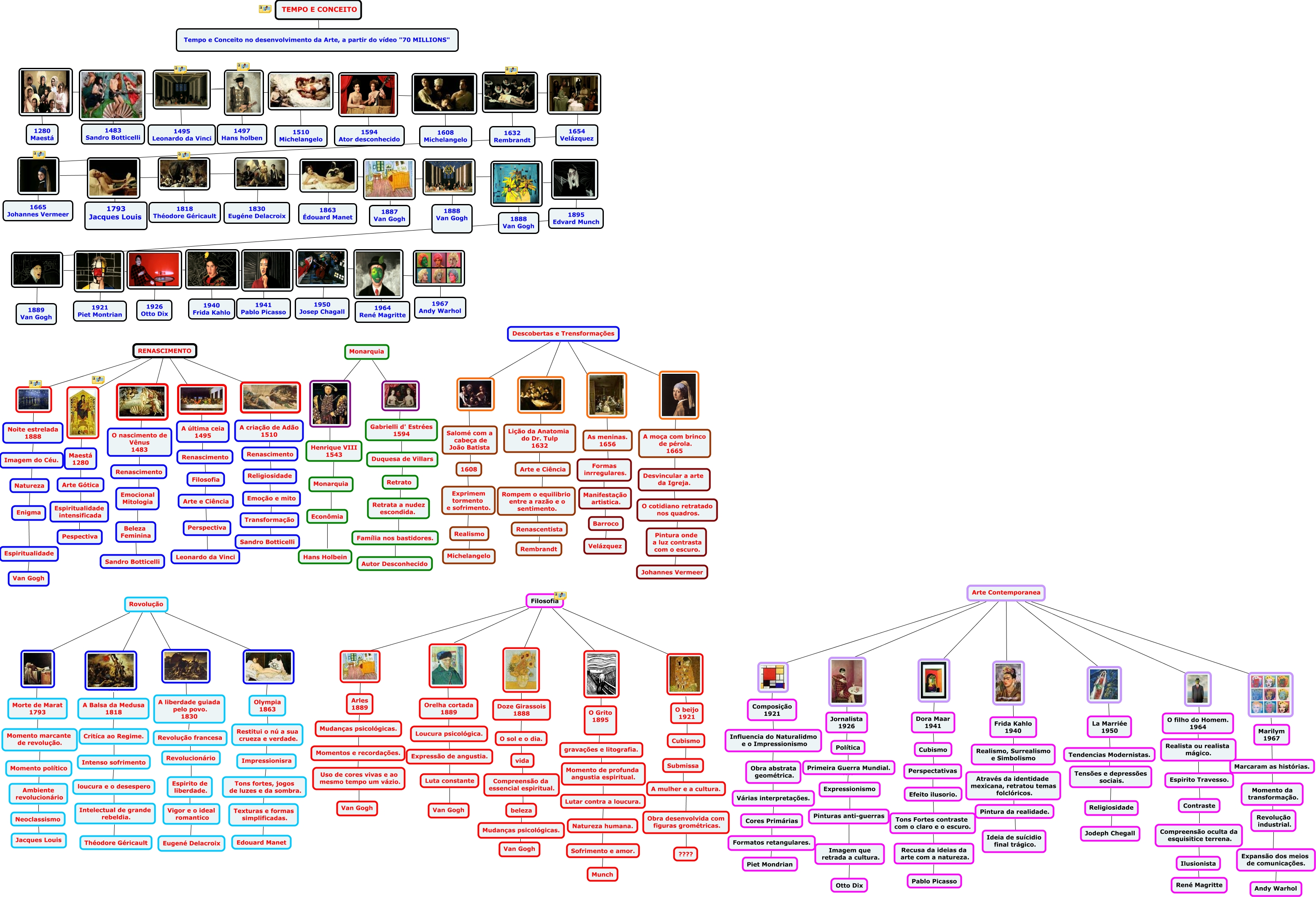 Esse mapa conceitual, produzido no IHMC CmapTools, tem a informação relacionada a: 70 milhões, Mudanças psicológicas. ???? Van Gogh, Henrique VIII 1543 ???? Monarquia, Vigor e o ideal romantico ???? Eugené Delacroix, ????, TEMPO E CONCEITO ???? Tempo e Conceito no desenvolvimento da Arte, a partir do vídeo "70 MILLIONS", vida ???? beleza, Tons fortes, jogos de luzes e da sombra. ???? Texturas e formas simplificadas., ???? 1921 Piet Montrian, Salomé com a cabeça de João Batista ???? 1608, ???? Arles 1889, Pintura onde a luz contrasta com o escuro. ???? Johannes Vermeer, Religiosidade ???? Emoção e mito, Cores Primárias ???? Formatos retangulares., Espiritualidade intensificada ???? Pespectiva, Pintura da realidade. ???? Ideia de suícidio final trágico., Momento político ???? Ambiente revolucionário, Barroco ???? Velázquez, Política ???? Primeira Guerra Mundial., ???? Salomé com a cabeça de João Batista, Filosofia ????