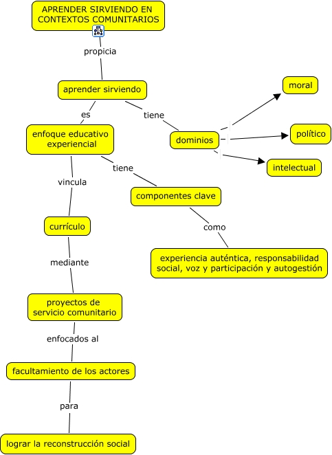 Este Cmap, tiene información relacionada con: capítulo 4, componentes clave como experiencia auténtica, responsabilidad social, voz y participación y autogestión, proyectos de servicio comunitario enfocados al facultamiento de los actores, dominios intelectual, APRENDER SIRVIENDO EN CONTEXTOS COMUNITARIOS propicia aprender sirviendo, currículo mediante proyectos de servicio comunitario, aprender sirviendo tiene dominios, enfoque educativo experiencial tiene componentes clave, dominios moral, aprender sirviendo es enfoque educativo experiencial, facultamiento de los actores para lograr la reconstrucción social, enfoque educativo experiencial vincula currículo, dominios político