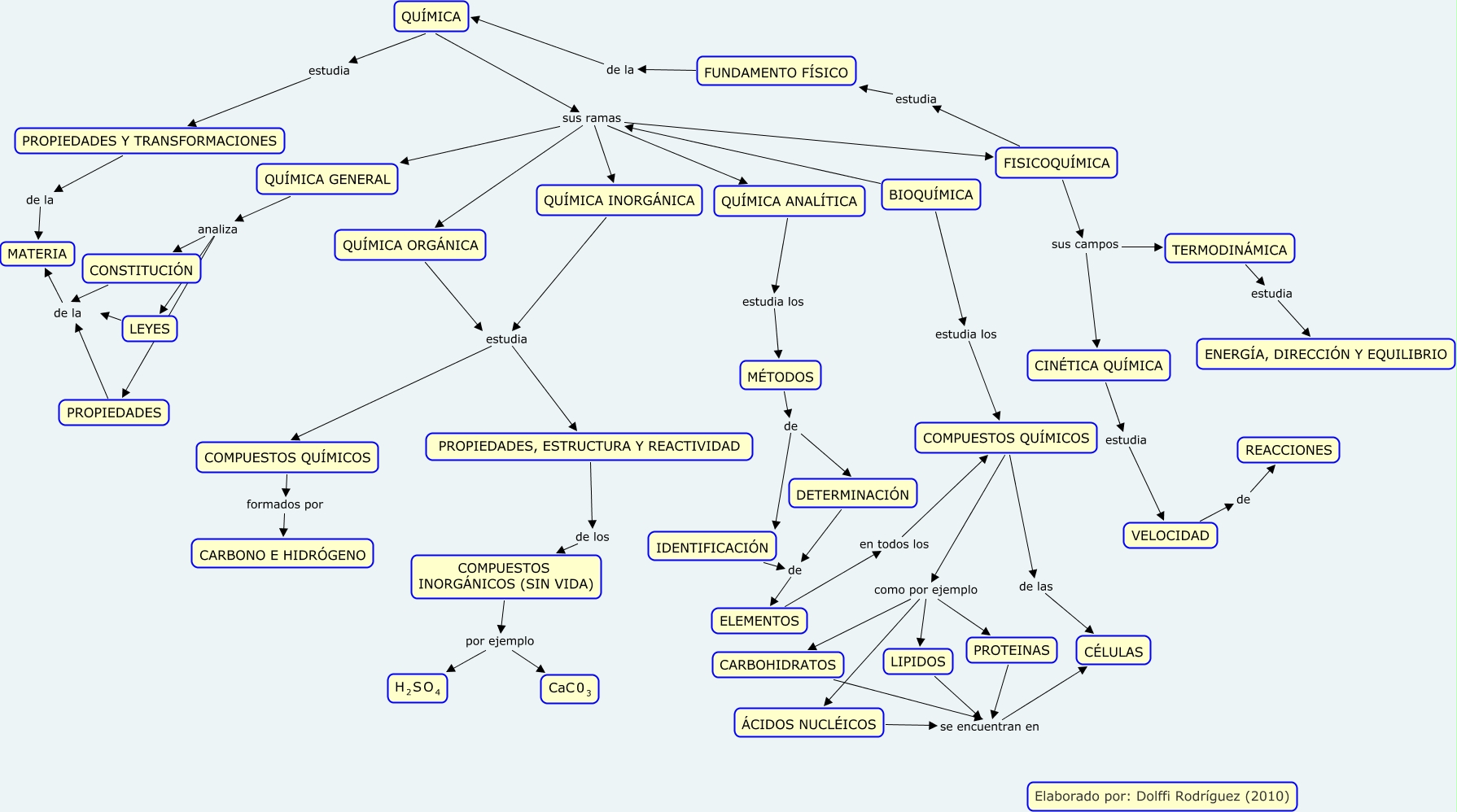 Este Cmap, tiene información relacionada con: RAMAS DE LA QUÍMICA, QUÍMICA sus ramas FISICOQUÍMICA, CINÉTICA QUÍMICA estudia VELOCIDAD, BIOQUÍMICA sus ramas QUÍMICA INORGÁNICA, COMPUESTOS QUÍMICOS de las CÉLULAS, QUÍMICA estudia PROPIEDADES Y TRANSFORMACIONES, BIOQUÍMICA sus ramas QUÍMICA ANALÍTICA, FISICOQUÍMICA estudia FUNDAMENTO FÍSICO, COMPUESTOS INORGÁNICOS (SIN VIDA) por ejemplo <math xmlns="http://www.w3.org/1998/Math/MathML"> <mrow> <mtext> CaC </mtext> <mmultiscripts> <mtext> 0 </mtext> <mtext> 3 </mtext> <none/> </mmultiscripts> </mrow> </math>, QUÍMICA sus ramas QUÍMICA GENERAL, QUÍMICA GENERAL analiza LEYES, QUÍMICA sus ramas QUÍMICA ANALÍTICA, QUÍMICA ORGÁNICA estudia COMPUESTOS QUÍMICOS, FUNDAMENTO FÍSICO de la QUÍMICA, BIOQUÍMICA sus ramas FISICOQUÍMICA, LIPIDOS se encuentran en CÉLULAS, COMPUESTOS QUÍMICOS como por ejemplo PROTEINAS, QUÍMICA ANALÍTICA estudia los MÉTODOS, BIOQUÍMICA estudia los COMPUESTOS QUÍMICOS, ELEMENTOS en todos los COMPUESTOS QUÍMICOS, CARBOHIDRATOS se encuentran en CÉLULAS