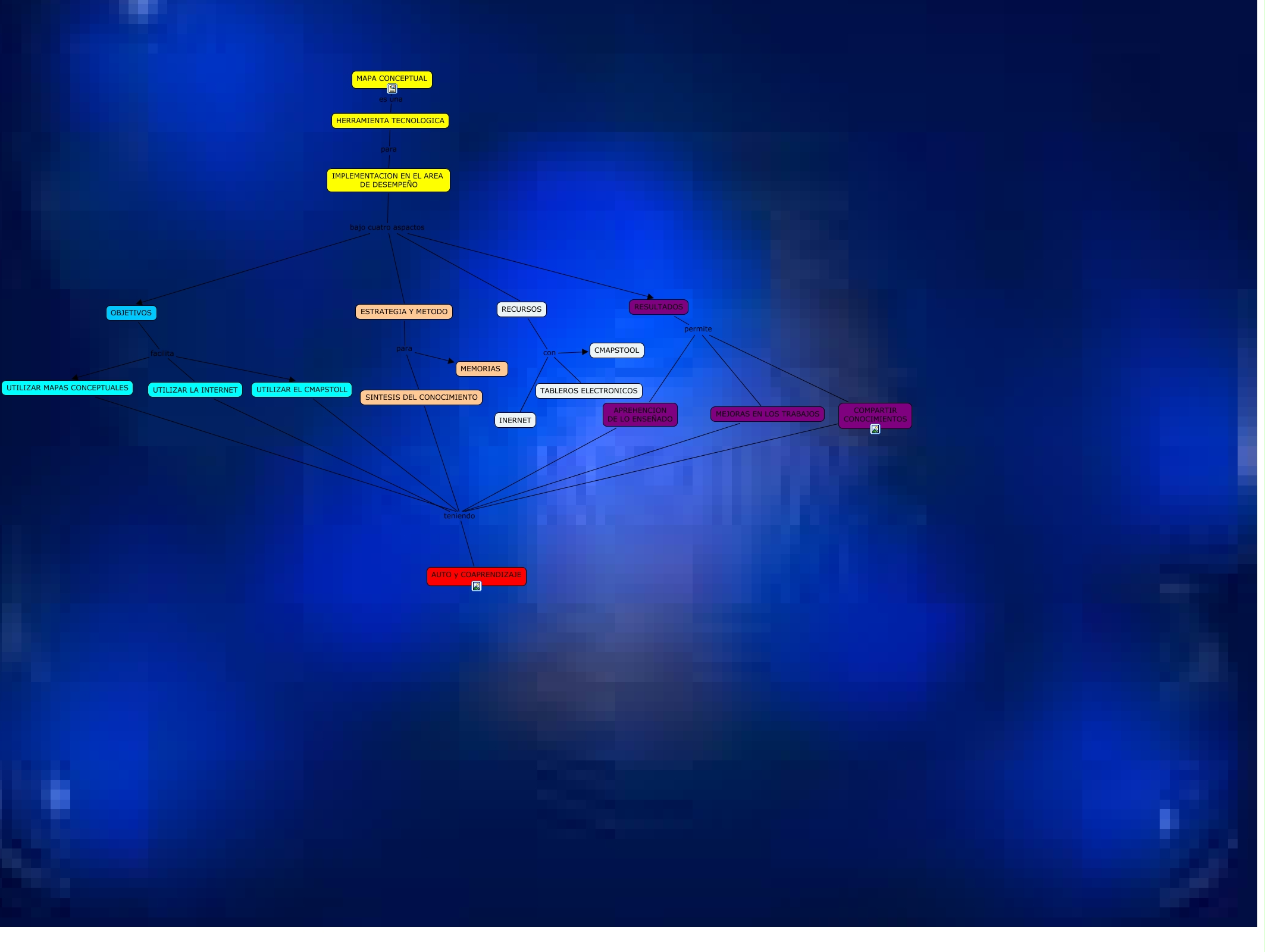 Este Cmap, tiene información relacionada con: HERRAMIENTA EXITOSA PARA EL APRENDIZAJE, IMPLEMENTACION EN EL AREA DE DESEMPEÑO bajo cuatro aspactos RESULTADOS, OBJETIVOS facilita UTILIZAR MAPAS CONCEPTUALES, RESULTADOS permite MEJORAS EN LOS TRABAJOS, ESTRATEGIA Y METODO para MEMORIAS, APREHENCION DE LO ENSEÑADO teniendo AUTO y COAPRENDIZAJE, UTILIZAR LA INTERNET teniendo AUTO y COAPRENDIZAJE, MAPA CONCEPTUAL es una HERRAMIENTA TECNOLOGICA, ESTRATEGIA Y METODO para SINTESIS DEL CONOCIMIENTO, IMPLEMENTACION EN EL AREA DE DESEMPEÑO bajo cuatro aspactos RECURSOS, SINTESIS DEL CONOCIMIENTO teniendo AUTO y COAPRENDIZAJE, IMPLEMENTACION EN EL AREA DE DESEMPEÑO bajo cuatro aspactos ESTRATEGIA Y METODO, RESULTADOS permite APREHENCION DE LO ENSEÑADO, RECURSOS con CMAPSTOOL, MEJORAS EN LOS TRABAJOS teniendo AUTO y COAPRENDIZAJE, UTILIZAR EL CMAPSTOLL teniendo AUTO y COAPRENDIZAJE, IMPLEMENTACION EN EL AREA DE DESEMPEÑO bajo cuatro aspactos OBJETIVOS, OBJETIVOS facilita UTILIZAR EL CMAPSTOLL, UTILIZAR MAPAS CONCEPTUALES teniendo AUTO y COAPRENDIZAJE, RECURSOS con TABLEROS ELECTRONICOS, OBJETIVOS facilita UTILIZAR LA INTERNET