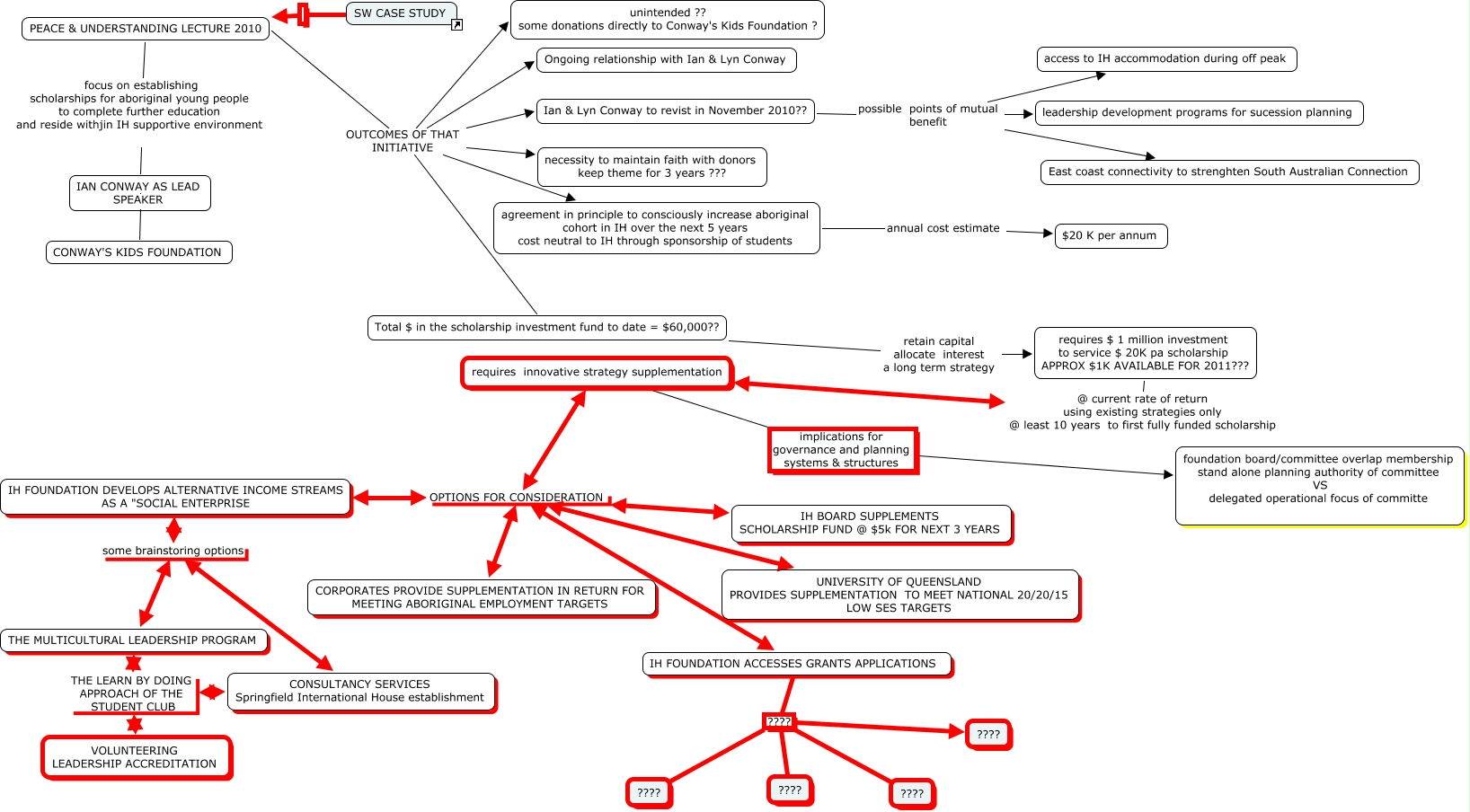 This Concept Map, created with IHMC CmapTools, has information related to: ABORIGINAL SCHOLARSHIP INTERNATIONAL HOUSE, IH FOUNDATION ACCESSES GRANTS APPLICATIONS ???? ????, requires innovative strategy supplementation OPTIONS FOR CONSIDERATION IH BOARD SUPPLEMENTS SCHOLARSHIP FUND @ $5k FOR NEXT 3 YEARS, requires innovative strategy supplementation OPTIONS FOR CONSIDERATION UNIVERSITY OF QUEENSLAND PROVIDES SUPPLEMENTATION TO MEET NATIONAL 20/20/15 LOW SES TARGETS, IH FOUNDATION ACCESSES GRANTS APPLICATIONS ???? ????, IAN CONWAY AS LEAD SPEAKER CONWAY'S KIDS FOUNDATION, IH FOUNDATION ACCESSES GRANTS APPLICATIONS ???? ????, Ian & Lyn Conway to revist in November 2010?? possible points of mutual benefit East coast connectivity to strenghten South Australian Connection, PEACE & UNDERSTANDING LECTURE 2010 OUTCOMES OF THAT INITIATIVE Ian & Lyn Conway to revist in November 2010??, PEACE & UNDERSTANDING LECTURE 2010 OUTCOMES OF THAT INITIATIVE Ongoing relationship with Ian & Lyn Conway, PEACE & UNDERSTANDING LECTURE 2010 OUTCOMES OF THAT INITIATIVE necessity to maintain faith with donors keep theme for 3 years ???, PEACE & UNDERSTANDING LECTURE 2010 focus on establishing scholarships for aboriginal young people to complete further education and reside withjin IH supportive environment IAN CONWAY AS LEAD SPEAKER, IH FOUNDATION DEVELOPS ALTERNATIVE INCOME STREAMS AS A "SOCIAL ENTERPRISE some brainstoring options THE MULTICULTURAL LEADERSHIP PROGRAM, requires innovative strategy supplementation OPTIONS FOR CONSIDERATION IH FOUNDATION ACCESSES GRANTS APPLICATIONS, requires innovative strategy supplementation OPTIONS FOR CONSIDERATION CORPORATES PROVIDE SUPPLEMENTATION IN RETURN FOR MEETING ABORIGINAL EMPLOYMENT TARGETS, THE MULTICULTURAL LEADERSHIP PROGRAM THE LEARN BY DOING APPROACH OF THE STUDENT CLUB CONSULTANCY SERVICES Springfield International House establishment, PEACE & UNDERSTANDING LECTURE 2010 OUTCOMES OF THAT INITIATIVE unintended ?? some donations directly to Conway's Kids Foundation ?, requires innovative strategy supplementation OPTIONS FOR CONSIDERATION IH FOUNDATION DEVELOPS ALTERNATIVE INCOME STREAMS AS A "SOCIAL ENTERPRISE, IH FOUNDATION DEVELOPS ALTERNATIVE INCOME STREAMS AS A "SOCIAL ENTERPRISE some brainstoring options CONSULTANCY SERVICES Springfield International House establishment, agreement in principle to consciously increase aboriginal cohort in IH over the next 5 years cost neutral to IH through sponsorship of students annual cost estimate $20 K per annum, Total $ in the scholarship investment fund to date = $60,000?? retain capital allocate interest a long term strategy requires $ 1 million investment to service $ 20K pa scholarship APPROX $1K AVAILABLE FOR 2011???