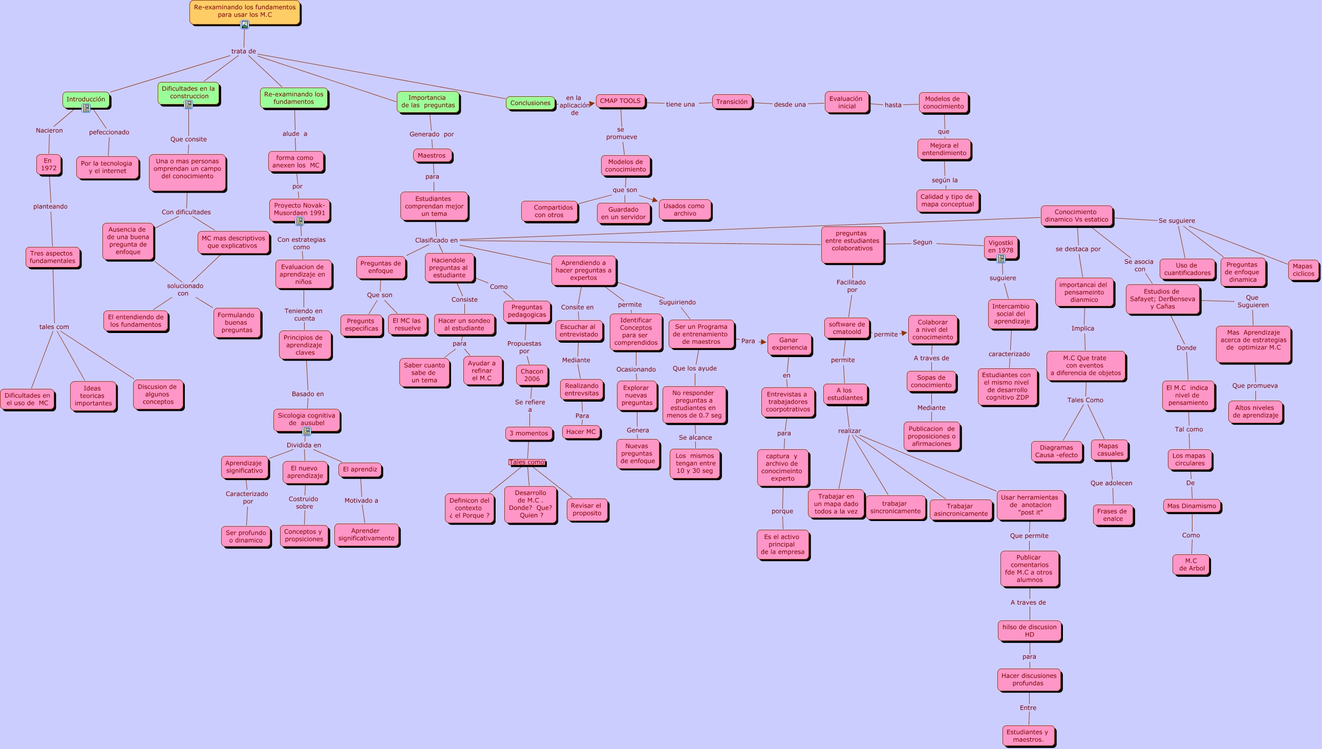 Este Cmap, tiene información relacionada con: RE-EXAMINANDO LOS FUNDAMENTOS PARA EL USO EFECTIVO DE MC, Aprendiendo a hacer preguntas a expertos permite Identificar Conceptos para ser comprendidos, preguntas entre estudiantes colaborativos Facilitado por software de cmatoold, Identificar Conceptos para ser comprendidos Ocasionando Explorar nuevas preguntas, Conocimiento dinamico Vs estatico Se asocia con Estudios de Safayet; DerBenseva y Cañas, Conclusiones trata de Re-examinando los fundamentos, Explorar nuevas preguntas Genera Nuevas preguntas de enfoque, preguntas entre estudiantes colaborativos Clasificado en Preguntas de enfoque, Sicologia cognitiva de ausubel Dividida en El nuevo aprendizaje, Entrevistas a trabajadores coorpotrativos para captura y archivo de conocimeinto experto, Mapas ciclicos Se suguiere Uso de cuantificadores, Dificultades en la construccion Que consite Una o mas personas omprendan un campo del conocimiento, Introducción trata de Re-examinando los fundamentos, Aprendiendo a hacer preguntas a expertos Clasificado en Preguntas de enfoque, A los estudiantes realizar Trabajar en un mapa dado todos a la vez, Introducción pefeccionado Por la tecnologia y el internet, Preguntas de enfoque Que son El MC las resuelve, Colaborar a nivel del conocimeinto A traves de Sopas de conocimiento, M.C Que trate con eventos a diferencia de objetos Tales Como Mapas casuales, 3 momentos Tales como Definicon del contexto ¿ el Porque ?, Conocimiento dinamico Vs estatico Se suguiere Uso de cuantificadores