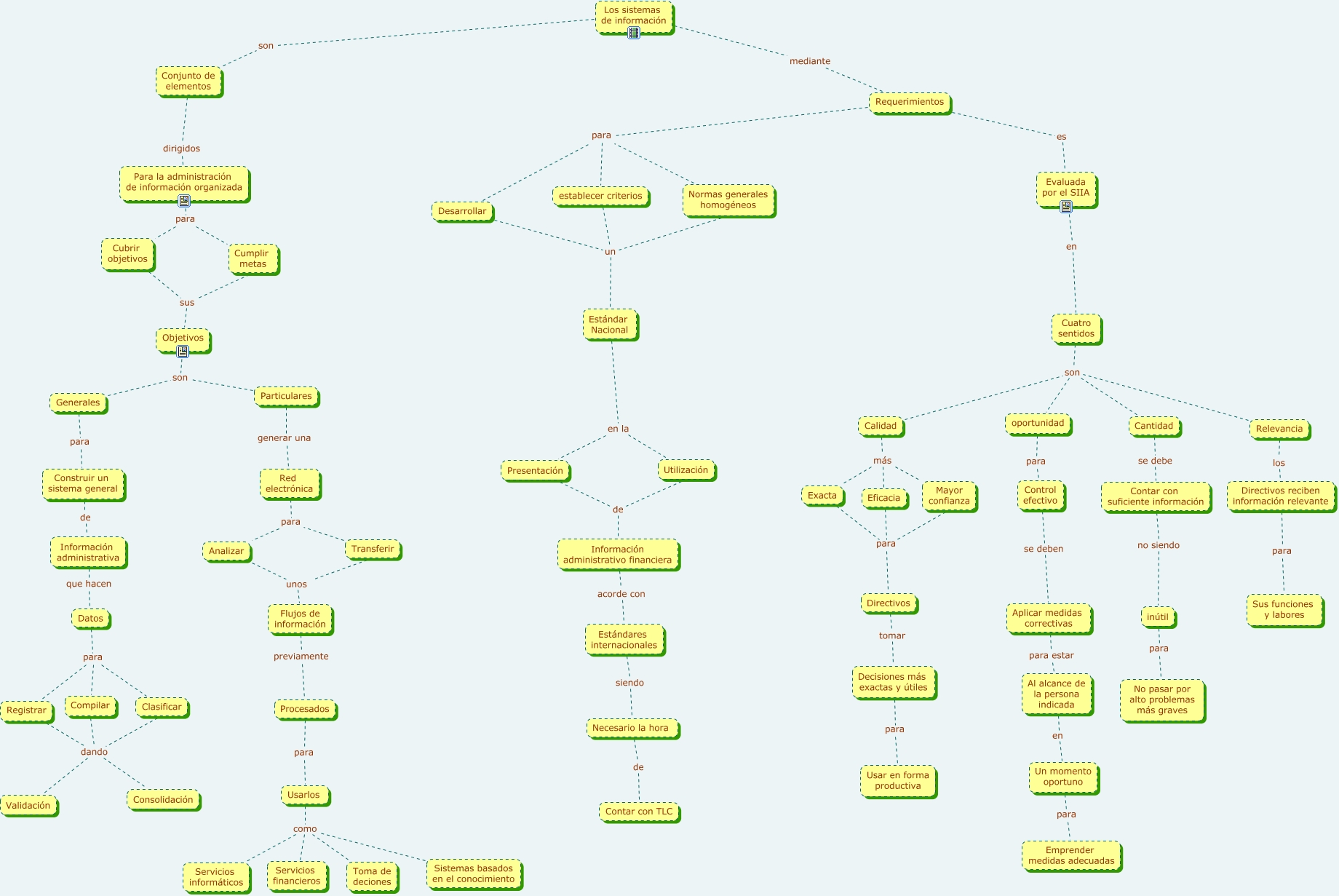 Este Cmap, tiene información relacionada con: Los sistemas de información, Sistemas basados en el conocimiento como Toma de deciones, Calidad son Cantidad, Datos para Compilar, Control efectivo se deben Aplicar medidas correctivas, Cuatro sentidos son oportunidad, Decisiones más exactas y útiles para Usar en forma productiva, Al alcance de la persona indicada en Un momento oportuno, Particulares generar una Red electrónica, Usarlos como Servicios informáticos, Usarlos como Toma de deciones, Sistemas basados en el conocimiento como Servicios financieros, Clasificar dando Validación, Calidad más Exacta, Normas generales homogéneos para establecer criterios, Usarlos como Servicios financieros, oportunidad para Control efectivo, Cumplir metas sus Objetivos, Un momento oportuno para Emprender medidas adecuadas, Relevancia son Cantidad, Generales para Construir un sistema general