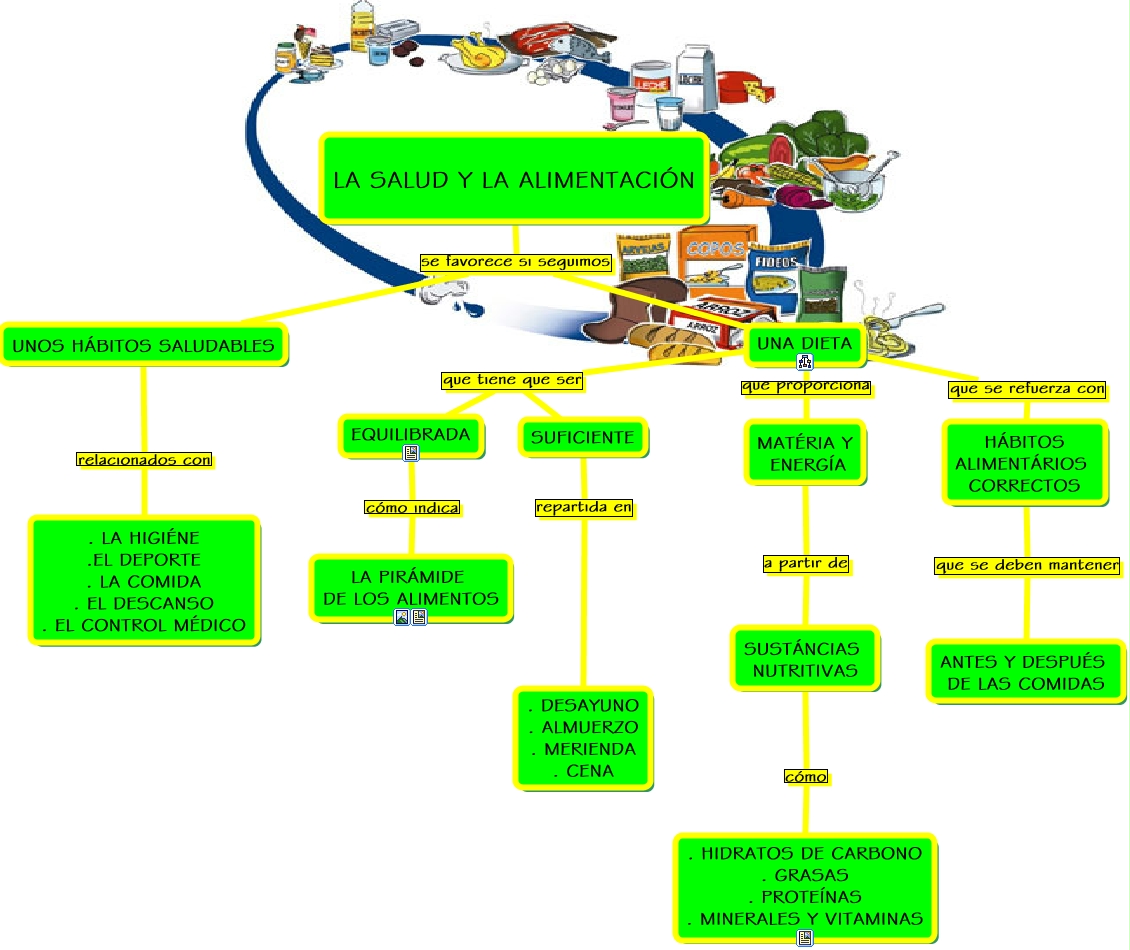 Este Cmap, tiene información relacionada con: LA SALUD Y LA ALIMENTACION, UNA DIETA que tiene que ser SUFICIENTE, LA SALUD Y LA ALIMENTACIÓN se favorece si seguimos UNOS HÁBITOS SALUDABLES, UNA DIETA que se refuerza con HÁBITOS ALIMENTÁRIOS CORRECTOS, EQUILIBRADA cómo indica LA PIRÁMIDE DE LOS ALIMENTOS, LA SALUD Y LA ALIMENTACIÓN se favorece si seguimos UNA DIETA, SUSTÁNCIAS NUTRITIVAS cómo . HIDRATOS DE CARBONO . GRASAS . PROTEÍNAS . MINERALES Y VITAMINAS, UNOS HÁBITOS SALUDABLES relacionados con . LA HIGIÉNE .EL DEPORTE . LA COMIDA . EL DESCANSO . EL CONTROL MÉDICO, MATÉRIA Y ENERGÍA a partir de SUSTÁNCIAS NUTRITIVAS, UNA DIETA que tiene que ser EQUILIBRADA, UNA DIETA que proporciona MATÉRIA Y ENERGÍA, SUFICIENTE repartida en . DESAYUNO . ALMUERZO . MERIENDA . CENA, HÁBITOS ALIMENTÁRIOS CORRECTOS que se deben mantener ANTES Y DESPUÉS DE LAS COMIDAS