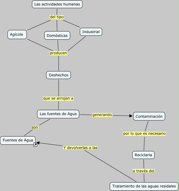 Este Cmap, tiene información relacionada con: Contaminación, Tratamiento de las aguas residales Y devolverlas a las Fuentes de Agua, Las actividades humanas del tipo Industrial, Reciclarla a través del Tratamiento de las aguas residales, Las fuentes de Agua son Fuentes de Agua, Domésticas producen Deshechos, Las actividades humanas del tipo Domésticas, Industrial producen Deshechos, Agícola producen Deshechos, Las actividades humanas del tipo Agícola, Deshechos que se arrojan a Las fuentes de Agua, Las fuentes de Agua generando Contaminación, Contaminación por lo que es necesario Reciclarla