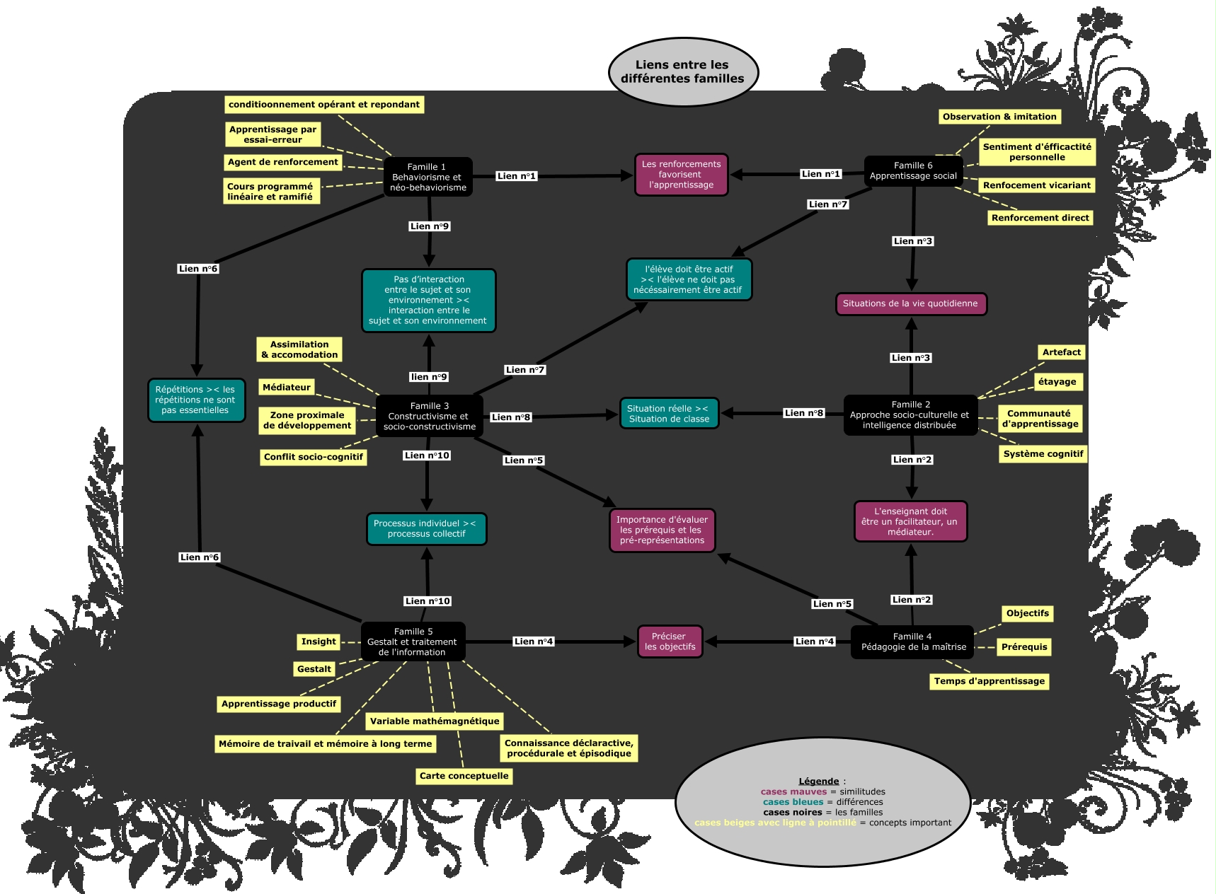 Cette carte de concepts créée avec IHMC CmapTools traite de: carte final avec titre, Famille 6 Apprentissage social ???? Observation & imitation, Famille 6 Apprentissage social ???? Renfocement vicariant, Famille 1 Behaviorisme et néo-behaviorisme Lien n°9 Pas d’interaction entre le sujet et son environnement >< interaction entre le sujet et son environnement, Famille 6 Apprentissage social Lien n°1 Les renforcements favorisent l'apprentissage, Famille 5 Gestalt et traitement de l'information ???? Connaissance déclaractive, procédurale et épisodique, Famille 1 Behaviorisme et néo-behaviorisme ???? Apprentissage par essai-erreur, Famille 1 Behaviorisme et néo-behaviorisme Lien n°1 Les renforcements favorisent l'apprentissage, Famille 5 Gestalt et traitement de l'information Lien n°6 Répétitions >< les répétitions ne sont pas essentielles, Famille 4 Pédagogie de la maîtrise Lien n°2 L'enseignant doit être un facilitateur, un médiateur., Famille 3 Constructivisme et socio-constructivisme ???? Médiateur, Famille 4 Pédagogie de la maîtrise ???? Temps d'apprentissage, Famille 2 Approche socio-culturelle et intelligence distribuée ???? étayage, Famille 1 Behaviorisme et néo-behaviorisme ???? Cours programmé linéaire et ramifié, Famille 1 Behaviorisme et néo-behaviorisme ???? Agent de renforcement, Famille 4 Pédagogie de la maîtrise ???? Prérequis, Famille 3 Constructivisme et socio-constructivisme lien n°9 Pas d’interaction entre le sujet et son environnement >< interaction entre le sujet et son environnement, Famille 2 Approche socio-culturelle et intelligence distribuée ???? Communauté d'apprentissage, Famille 6 Apprentissage social ???? Sentiment d'éfficactité personnelle, Famille 3 Constructivisme et socio-constructivisme Lien n°7 l'élève doit être actif >< l'élève ne doit pas nécéssairement être actif, Famille 2 Approche socio-culturelle et intelligence distribuée Lien n°2 L'enseignant doit être un facilitateur, un médiateur.