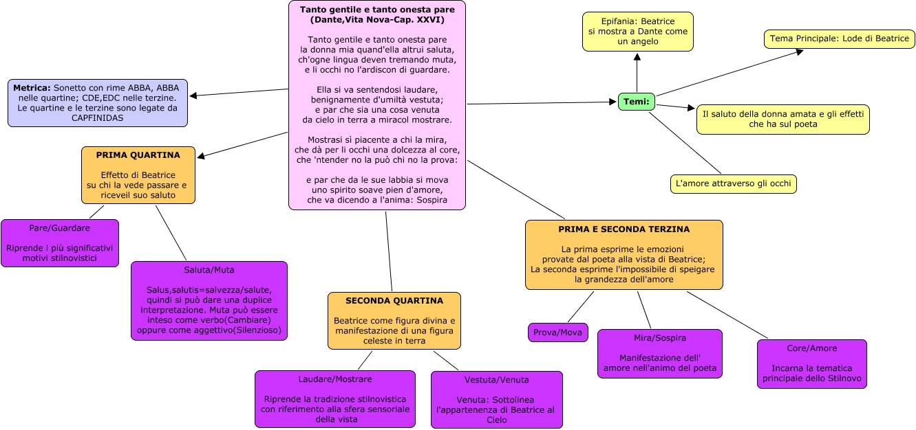 Questa Cmap, creata con IHMC CmapTools, contiene informazioni relative a: Tanto Gentile e tanto onesta pare, Dante Alighieri. Giulia Mocchi, Temi: Tema Principale: Lode di Beatrice, Tanto gentile e tanto onesta pare (Dante,Vita Nova-Cap. XXVI) Tanto gentile e tanto onesta pare la donna mia quand'ella altrui saluta, ch'ogne lingua deven tremando muta, e li occhi no l'ardiscon di guardare. Ella si va sentendosi laudare, benignamente d'umiltà vestuta; e par che sia una cosa venuta da cielo in terra a miracol mostrare. Mostrasi sì piacente a chi la mira, che dà per li occhi una dolcezza al core, che 'ntender no la può chi no la prova: e par che da le sue labbia si mova uno spirito soave pien d'amore, che va dicendo a l'anima: Sospira PRIMA QUARTINA Effetto di Beatrice su chi la vede passare e riceveil suo saluto, Tanto gentile e tanto onesta pare (Dante,Vita Nova-Cap. XXVI) Tanto gentile e tanto onesta pare la donna mia quand'ella altrui saluta, ch'ogne lingua deven tremando muta, e li occhi no l'ardiscon di guardare. Ella si va sentendosi laudare, benignamente d'umiltà vestuta; e par che sia una cosa venuta da cielo in terra a miracol mostrare. Mostrasi sì piacente a chi la mira, che dà per li occhi una dolcezza al core, che 'ntender no la può chi no la prova: e par che da le sue labbia si mova uno spirito soave pien d'amore, che va dicendo a l'anima: Sospira ???? Metrica: Sonetto con rime ABBA, ABBA nelle quartine; CDE,EDC nelle terzine. Le quartine e le terzine sono legate da CAPFINIDAS, Temi: Epifania: Beatrice si mostra a Dante come un angelo, Temi: L'amore attraverso gli occhi, Tanto gentile e tanto onesta pare (Dante,Vita Nova-Cap. XXVI) Tanto gentile e tanto onesta pare la donna mia quand'ella altrui saluta, ch'ogne lingua deven tremando muta, e li occhi no l'ardiscon di guardare. Ella si va sentendosi laudare, benignamente d'umiltà vestuta; e par che sia una cosa venuta da cielo in terra a miracol mostrare. Mostrasi sì piacente a chi la mira, che dà per li occhi una dolcezza al core, che 'ntender no la può chi no la prova: e par che da le sue labbia si mova uno spirito soave pien d'amore, che va dicendo a l'anima: Sospira Temi:, PRIMA QUARTINA Effetto di Beatrice su chi la vede passare e riceveil suo saluto Saluta/Muta Salus,salutis=salvezza/salute, quindi si può dare una duplice interpretazione. Muta può essere inteso come verbo(Cambiare) oppure come aggettivo(Silenzioso), PRIMA E SECONDA TERZINA La prima esprime le emozioni provate dal poeta alla vista di Beatrice; La seconda esprime l'impossibile di speigare la grandezza dell'amore Mira/Sospira Manifestazione dell' amore nell'animo del poeta, PRIMA QUARTINA Effetto di Beatrice su chi la vede passare e riceveil suo saluto Pare/Guardare Riprende i più significativi motivi stilnovistici, Temi: Il saluto della donna amata e gli effetti che ha sul poeta, Tanto gentile e tanto onesta pare (Dante,Vita Nova-Cap. XXVI) Tanto gentile e tanto onesta pare la donna mia quand'ella altrui saluta, ch'ogne lingua deven tremando muta, e li occhi no l'ardiscon di guardare. Ella si va sentendosi laudare, benignamente d'umiltà vestuta; e par che sia una cosa venuta da cielo in terra a miracol mostrare. Mostrasi sì piacente a chi la mira, che dà per li occhi una dolcezza al core, che 'ntender no la può chi no la prova: e par che da le sue labbia si mova uno spirito soave pien d'amore, che va dicendo a l'anima: Sospira SECONDA QUARTINA Beatrice come figura divina e manifestazione di una figura celeste in terra, SECONDA QUARTINA Beatrice come figura divina e manifestazione di una figura celeste in terra Laudare/Mostrare Riprende la tradizione stilnovistica con riferimento alla sfera sensoriale della vista, Tanto gentile e tanto onesta pare (Dante,Vita Nova-Cap. XXVI) Tanto gentile e tanto onesta pare la donna mia quand'ella altrui saluta, ch'ogne lingua deven tremando muta, e li occhi no l'ardiscon di guardare. Ella si va sentendosi laudare, benignamente d'umiltà vestuta; e par che sia una cosa venuta da cielo in terra a miracol mostrare. Mostrasi sì piacente a chi la mira, che dà per li occhi una dolcezza al core, che 'ntender no la può chi no la prova: e par che da le sue labbia si mova uno spirito soave pien d'amore, che va dicendo a l'anima: Sospira PRIMA E SECONDA TERZINA La prima esprime le emozioni provate dal poeta alla vista di Beatrice; La seconda esprime l'impossibile di speigare la grandezza dell'amore, SECONDA QUARTINA Beatrice come figura divina e manifestazione di una figura celeste in terra Vestuta/Venuta Venuta: Sottolinea l'appartenenza di Beatrice al Cielo, PRIMA E SECONDA TERZINA La prima esprime le emozioni provate dal poeta alla vista di Beatrice; La seconda esprime l'impossibile di speigare la grandezza dell'amore Prova/Mova, PRIMA E SECONDA TERZINA La prima esprime le emozioni provate dal poeta alla vista di Beatrice; La seconda esprime l'impossibile di speigare la grandezza dell'amore Core/Amore Incarna la tematica principale dello Stilnovo