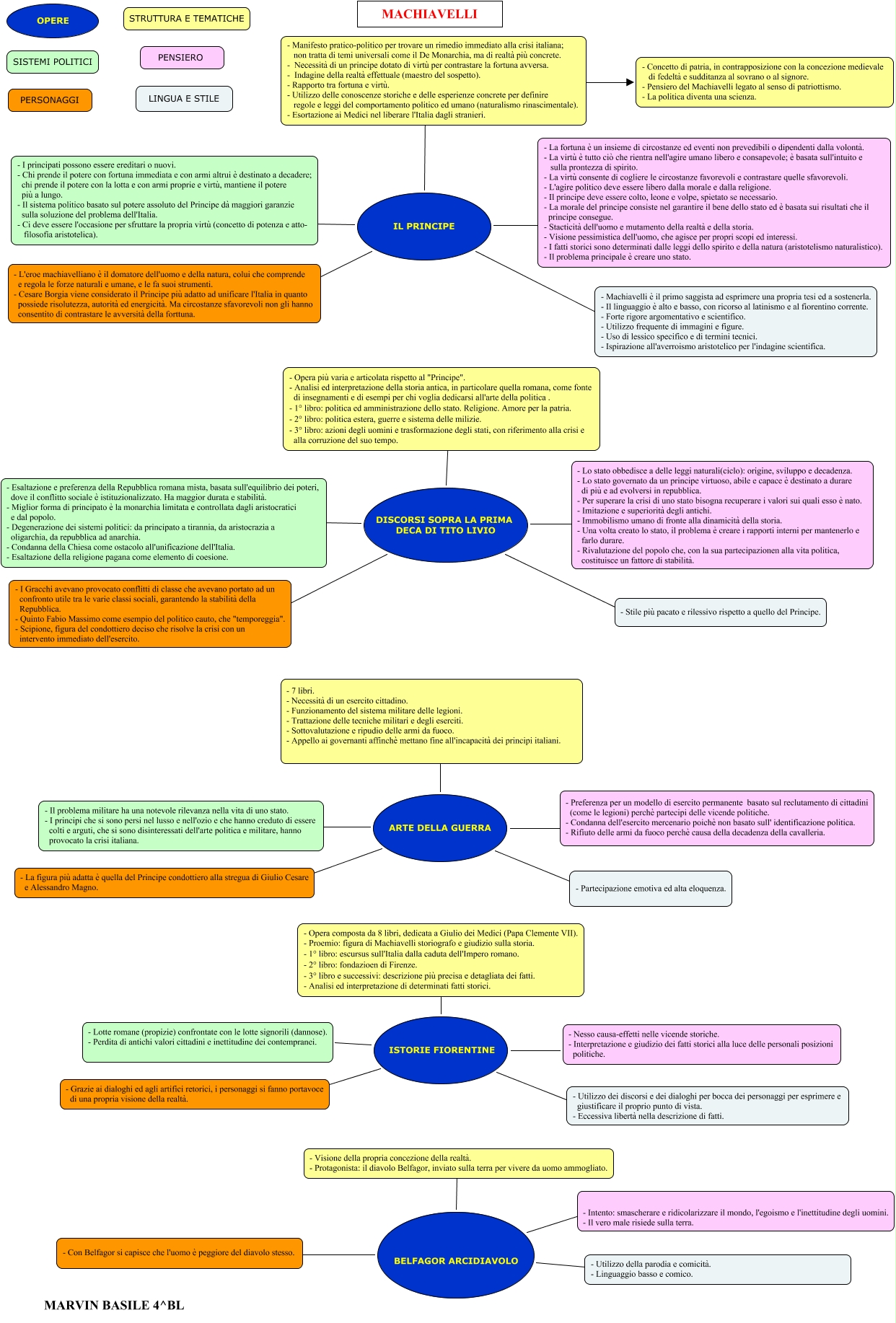 Questa Cmap, creata con IHMC CmapTools, contiene informazioni relative a: Machiavelli_Marvin Basile, DISCORSI SOPRA LA PRIMA DECA DI TITO LIVIO ???? - Lo stato obbedisce a delle leggi naturali(ciclo): origine, sviluppo e decadenza. - Lo stato governato da un principe virtuoso, abile e capace è destinato a durare di più e ad evolversi in repubblica. - Per superare la crisi di uno stato bisogna recuperare i valori sui quali esso è nato. - Imitazione e superiorità degli antichi. - Immobilismo umano di fronte alla dinamicità della storia. - Una volta creato lo stato, il problema è creare i rapporti interni per mantenerlo e farlo durare. - Rivalutazione del popolo che, con la sua partecipazionen alla vita politica, costituisce un fattore di stabilità., BELFAGOR ARCIDIAVOLO ???? - Utilizzo della parodia e comicità. - Linguaggio basso e comico., BELFAGOR ARCIDIAVOLO ???? - Intento: smascherare e ridicolarizzare il mondo, l'egoismo e l'inettitudine degli uomini. - Il vero male risiede sulla terra., ARTE DELLA GUERRA ???? - Partecipazione emotiva ed alta eloquenza., - Manifesto pratico-politico per trovare un rimedio immediato alla crisi italiana; non tratta di temi universali come il De Monarchia, ma di realtà più concrete. - Necessità di un principe dotato di virtù per contrastare la fortuna avversa. - Indagine della realtà effettuale (maestro del sospetto). - Rapporto tra fortuna e virtù. - Utilizzo delle conoscenze storiche e delle esperienze concrete per definire regole e leggi del comportamento politico ed umano (naturalismo rinascimentale). - Esortazione ai Medici nel liberare l'Italia dagli stranieri. ???? - Concetto di patria, in contrapposizione con la concezione medievale di fedeltà e sudditanza al sovrano o al signore. - Pensiero del Machiavelli legato al senso di patriottismo. - La politica diventa una scienza., IL PRINCIPE ???? - Manifesto pratico-politico per trovare un rimedio immediato alla crisi italiana; non tratta di temi universali come il De Monarchia, ma di realtà più concrete. - Necessità di un principe dotato di virtù per contrastare la fortuna avversa. - Indagine della realtà effettuale (maestro del sospetto). - Rapporto tra fortuna e virtù. - Utilizzo delle conoscenze storiche e delle esperienze concrete per definire regole e leggi del comportamento politico ed umano (naturalismo rinascimentale). - Esortazione ai Medici nel liberare l'Italia dagli stranieri., ARTE DELLA GUERRA ???? - La figura più adatta è quella del Principe condottiero alla stregua di Giulio Cesare e Alessandro Magno., DISCORSI SOPRA LA PRIMA DECA DI TITO LIVIO ???? - Opera più varia e articolata rispetto al "Principe". - Analisi ed interpretazione della storia antica, in particolare quella romana, come fonte di insegnamenti e di esempi per chi voglia dedicarsi all'arte della politica . - 1° libro: politica ed amministrazione dello stato. Religione. Amore per la patria. - 2° libro: politica estera, guerre e sistema delle milizie. - 3° libro: azioni degli uomini e trasformazione degli stati, con riferimento alla crisi e alla corruzione del suo tempo., DISCORSI SOPRA LA PRIMA DECA DI TITO LIVIO ???? - Esaltazione e preferenza della Repubblica romana mista, basata sull'equilibrio dei poteri, dove il conflitto sociale è istituzionalizzato. Ha maggior durata e stabilità. - Miglior forma di principato è la monarchia limitata e controllata dagli aristocratici e dal popolo. - Degenerazione dei sistemi politici: da principato a tirannia, da aristocrazia a oligarchia, da repubblica ad anarchia. - Condanna della Chiesa come ostacolo all'unificazione dell'Italia. - Esaltazione della religione pagana come elemento di coesione., BELFAGOR ARCIDIAVOLO ???? - Visione della propria concezione della realtà. - Protagonista: il diavolo Belfagor, inviato sulla terra per vivere da uomo ammogliato., ISTORIE FIORENTINE ???? - Lotte romane (propizie) confrontate con le lotte signorili (dannose). - Perdita di antichi valori cittadini e inettitudine dei contempranei., ISTORIE FIORENTINE ???? - Grazie ai dialoghi ed agli artifici retorici, i personaggi si fanno portavoce di una propria visione della realtà., DISCORSI SOPRA LA PRIMA DECA DI TITO LIVIO ???? - Stile più pacato e rilessivo rispetto a quello del Principe., BELFAGOR ARCIDIAVOLO ???? - Visione della propria concezione della realtà. - Protagonista: il diavolo Belfagor, inviato sulla terra per vivere da uomo ammogliato., IL PRINCIPE ???? - La fortuna è un insieme di circostanze ed eventi non prevedibili o dipendenti dalla volontà. - La virtù è tutto ciò che rientra nell'agire umano libero e consapevole; è basata sull'intuito e sulla prontezza di spirito. - La virtù consente di cogliere le circostanze favorevoli e contrastare quelle sfavorevoli. - L'agire politico deve essere libero dalla morale e dalla religione. - Il principe deve essere colto, leone e volpe, spietato se necessario. - La morale del principe consiste nel garantire il bene dello stato ed è basata sui risultati che il principe consegue. - Stacticità dell'uomo e mutamento della realtà e della storia. - Visione pessimistica dell'uomo, che agisce per propri scopi ed interessi. - I fatti storici sono determinati dalle leggi dello spirito e della natura (aristotelismo naturalistico). - Il problema principale è creare uno stato., ISTORIE FIORENTINE ???? - Nesso causa-effetti nelle vicende storiche. - Interpretazione e giudizio dei fatti storici alla luce delle personali posizioni politiche., BELFAGOR ARCIDIAVOLO ???? - Intento: smascherare e ridicolarizzare il mondo, l'egoismo e l'inettitudine degli uomini. - Il vero male risiede sulla terra., BELFAGOR ARCIDIAVOLO ???? - Con Belfagor si capisce che l'uomo è peggiore del diavolo stesso., ARTE DELLA GUERRA ???? - Il problema militare ha una notevole rilevanza nella vita di uno stato. - I principi che si sono persi nel lusso e nell'ozio e che hanno creduto di essere colti e arguti, che si sono disinteressati dell'arte po