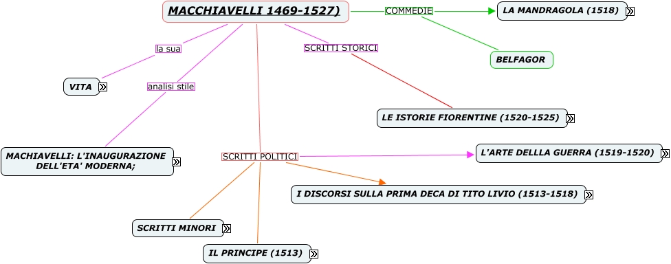 Questa Cmap, creata con IHMC CmapTools, contiene informazioni relative a: Machiavelli - Pesenti Davide, tutti caratterizzati negativamente. anche famiglia e Chiesa; e quindi amaro pessimismo dell'autore, scarsa fiducia nelle sitituzioni;, l'autore non identifica il bene dello Stato con il bene morale collettivo; cioè Machiavelli fa dipendere il successo di un'azione politica di un sovrano con il successo dello Stato; iil bene morale non coincide più con il bene dello Stato;, ufficiali tra i quali commissarie: relazioni sugli incarichi di politica interna;, Machiavelli, da buon saggista qual'era, si disinteressa (relativamente) della documentazione storica ed oggettiva, poichè vuole mettere in risalto le implicazioni politiche e sociali: per Machiavelli la storia non sono fatti ma un'interpretazione dei fatti; anche se per mantenere un certo distacco dall'opera si ferma a fatti antecedenti alla sua nascita;, MACCHIAVELLI 1469-1527) COMMEDIE LA MANDRAGOLA (1518), MACCHIAVELLI 1469-1527) COMMEDIE BELFAGOR, tra il 1502 e il 1512 compie molti viaggi, coprendo sempre alte cariche della Repubblica fiorentina in questo periodo conosce Cesare Borgia, detto il Valentino, il primo, il Principe, narra di come uno Stato nasce, di quali virtù l'uomo chiave, il sovrano appunto, deve possedere; infatti quando è solo un uomo a creare lo Stato, quest'ultimo assumerà per forza di cose la forma del Principato;, LA MANDRAGOLA (1518) personaggi tutti caratterizzati negativamente. anche famiglia e Chiesa;, L'ARTE DELLA GUERRA ed altri scritti politici caratteristiche tono appassionato ed impetuoso. assolve anche una funzione politica;, MACCHIAVELLI 1469-1527) analisi stile MACHIAVELLI: L'INAUGURAZIONE DELL'ETA' MODERNA;, IL PRINCIPE caratteristiche 4) "ragion di Stato" (gesuiti): Machiavelli riprende il tema della virtù politica separata dalla virtù morale e, denunciando ipocrisie e mezze misure, individua nel binomio animale-uomo, forza-intelletto la via da seguire;, Machiavelli, da buon saggista qual'era, si disinteressa (relativamente) della documentazione storica ed oggettiva, poichè vuole mettere in risalto le implicazioni politiche e sociali: per Machiavelli la storia non sono fatti ma un'interpretazione dei fatti; infatti sotto il profilo puramente storico, non si può considerare una grande opera: mancano dettagli e precisazioni;, Machiavelli, da buon saggista qual'era, si disinteressa (relativamente) della documentazione storica ed oggettiva, poichè vuole mettere in risalto le implicazioni politiche e sociali: per Machiavelli la storia non sono fatti ma un'interpretazione dei fatti; infatti narrazione selettiva: l'autore sceglie i fatti che più i prestano alla sua interpretazione politica;, il secondo, I Discorsi, ci spiega come uno Stato debba mantenersi e quali modifiche debba apportare nel corso della sua esistenza; supportato da idee rinascimentali quali concezione naturalistica e antistoricista: l'uomo non cambia nel corso dei secoli, ne l'evoluzione storica ne modifica i comportamenti;, MACCHIAVELLI 1469-1527) SCRITTI POLITICI SCRITTI MINORI, e ricerca di una relazione con il Principe; si è notato che certamente l'uno a condizionato l'altro per le idee e per lo stile;, L'ARTE DELLA GUERRA ed altri scritti politici caratteristiche Sottovalutazione armi da fuoco: propone una serie di consigli specifici ed efficaci per fortificazioni, assedi tecnica militare ma non comprende il grande potenziale della nuova arma;, quando è solo un uomo a creare lo Stato, quest'ultimo assumerà per forza di cose la forma del Principato; ma poichè lo Stato non è altro che un equilibrio tra popolo e classe nobile, è necessaria una sua evoluzione;, verso il 1520, partecipa alle riunioni degli Orti Oricellari, cenacoli culturali. infine dopo il sacco di Roma, nel 1527, e la scacciata dei Medici, viene accusato di aver collaborato con loro. muore lo stesso anno in giugno.
