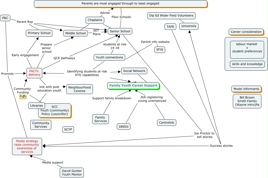 This Concept Map, created with IHMC CmapTools, has information related to: Family Youth Career Support, Social Network ???? Family Youth Career Support, PACTs delivery Early engagement Primary School, P&C Parent Rep Middle School, Senior School Joe Proctor to tell stories Media strategy raise community awareness of services, Chaplains ???? Middle School, P&C Promote PACTs delivery, Parents are most engaged through to least engaged Flexi Schools Senior School, SCC Youth (community) Policy (councillor) Community Funding PACTs delivery, PACTs delivery QCE pathways Senior School, Youth connections Identifying students at risk RTO capabilities Social Network, TAFE Success stories University, PACTs delivery Prepare senior school Middle School, Youth connections students at risk 14-18 Senior School, University ???? Dip Ed Wider Field Volunteers, PACTs delivery link with post education youth Libraries, DEEDI JSA registering young unemployed Family Youth Career Support, P&C Promote Media strategy raise community awareness of services, David Gunter Youth Mentor Media support Media strategy raise community awareness of services, Centrelink JSA registering young unemployed Family Youth Career Support, Family Services Support family breakdown Family Youth Career Support