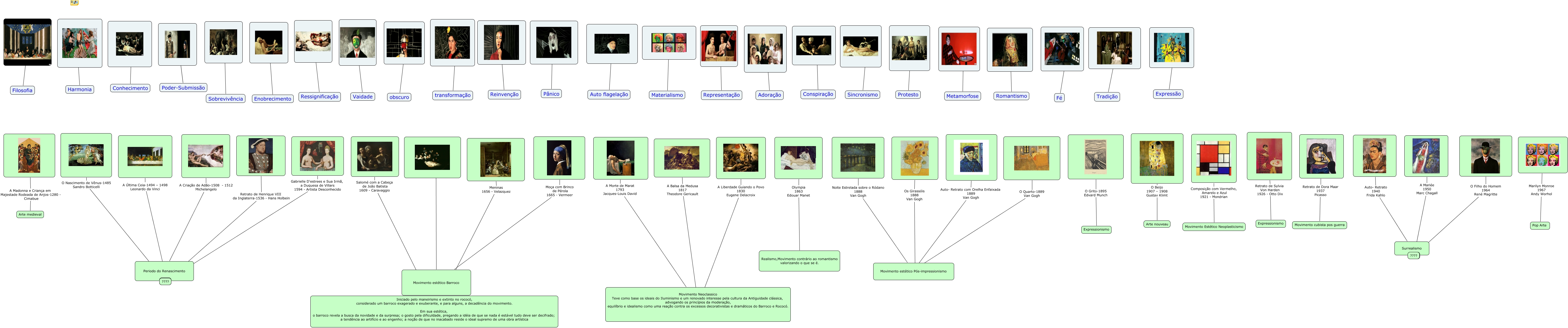 Esse mapa conceitual, produzido no IHMC CmapTools, tem a informação relacionada a: Tempo e conceito no desenvolvimento da Arte, vídeo 70 Millions, ???? ???? Adoração, Retrato de Henrique VIII da Inglaterra-1536 - Hans Holbein ????, Auto- Retrato 1940 Frida Kahlo Surrealismo, ???? Filosofia, ???? Reinvenção, ???? Pânico, O Nascimento de Vênus-1485 Sandro Botticelli ????, Auto- Retrato com Orelha Enfaixada 1889 Van Gogh ????, ???? Expressão, ???? Metamorfose, ???? ???? Harmonia, Meninas 1656 - Velazquez Iniciado pelo maneirismo e extinto no rococó, considerado um barroco exagerado e exuberante, e para alguns, a decadência do movimento. Em sua estética, o barroco revela a busca da novidade e da surpresa; o gosto pela dificuldade, pregando a idéia de que se nada é estável tudo deve ser decifrado; a tendência ao artifício e ao engenho; a noção de que no inacabado reside o ideal supremo de uma obra artística, ???? ???? Sobrevivência, A Madonna e Criança em Majestade Rodeada de Anjos-1280 - Cimabue Arte medieval, O Beijo 1907 – 1908 Gustav Klimt Arte nouveau, O Grito-1895 Edvard Munch Expressionismo, ???? Ressignificação, A Morte de Marat 1793 Jacques-Louis David Movimento Neoclassico Teve como base os ideais do Iluminismo e um renovado interesse pela cultura da Antiguidade clássica, advogando os princípios da moderação, equilíbrio e idealismo como uma reação contra os excessos decorativistas e dramáticos do Barroco e Rococó., ???? ???? Fé, ???? transformação