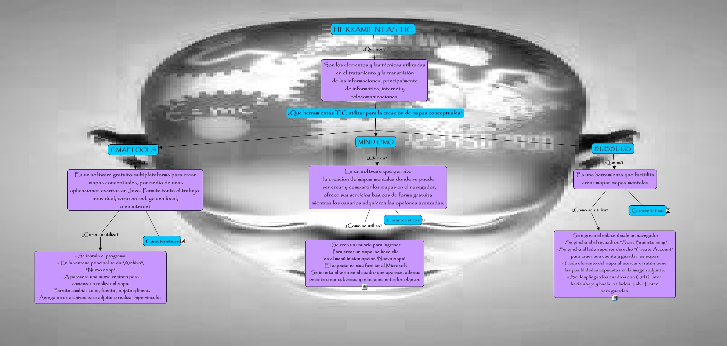 Este Cmap, tiene información relacionada con: Herramientas TIC para la elaboraciòn de mapas conceptuales, Es un software gratuito multiplataforma para crear mapas conceptuales, por medio de unas aplicaciones escritas en Java. Permite tanto el trabajo individual, como en red, ya sea local, o en internet Caracteristicas Esta disponible en español, Es un software que permite la creacion de mapas mentales donde se puede ver crear y compartir los mapas en el navegador, ofrece sus servicios basicos de forma gratuita mientras los usuarios adquieren las opciones avanzadas. Caracteristicas La versión gratuita limita el número de mapas privado a siete y deshabilita algunas funciones especiales, Es una herramienta que facitilita crear mapar mapas mentales Caracteristicas - Es sencillo de utilizar, Son los elementos y las técnicas utilizadas en el tratamiento y la transmisión de las informaciones, principalmente de informática, internet y telecomunicaciones. ¿Que herramientas TIC utilizar para la creaciòn de mapas conceptuales? BUBBL.US, Es una herramienta que facitilita crear mapar mapas mentales Caracteristicas -Se puede usar desde un navegador, CMAPTOOLS ¿Que es? Es un software gratuito multiplataforma para crear mapas conceptuales, por medio de unas aplicaciones escritas en Java. Permite tanto el trabajo individual, como en red, ya sea local, o en internet, Son los elementos y las técnicas utilizadas en el tratamiento y la transmisión de las informaciones, principalmente de informática, internet y telecomunicaciones. ¿Que herramientas TIC utilizar para la creaciòn de mapas conceptuales? MIND OMO, Es una herramienta que facitilita crear mapar mapas mentales Caracteristicas - Su contenido esta en ingles, BUBBL.US ¿Que es? Es una herramienta que facitilita crear mapar mapas mentales, Son los elementos y las técnicas utilizadas en el tratamiento y la transmisión de las informaciones, principalmente de informática, internet y telecomunicaciones. ¿Que herramientas TIC utilizar para la creaciòn de mapas conceptuales? CMAPTOOLS, Es una herramienta que facitilita crear mapar mapas mentales Caracteristicas - Se pueden crear cuantos se necesiten, HERRAMIENTAS TIC ¿Qué son? Son los elementos y las técnicas utilizadas en el tratamiento y la transmisión de las informaciones, principalmente de informática, internet y telecomunicaciones., Es una herramienta que facitilita crear mapar mapas mentales Caracteristicas - Integra objetos en Flash para facilitar la movilidad de los objetos, Es un software gratuito multiplataforma para crear mapas conceptuales, por medio de unas aplicaciones escritas en Java. Permite tanto el trabajo individual, como en red, ya sea local, o en internet Caracteristicas Permite enlazar mapas conceptuales, se pueden publicar en blogs, enviar por correo electronico, subirlo a un sitio web e insertar imagenes, videos, BUBBL.US ¿Que es? Es una herramienta que facitilita crear mapar mapas mentales, Es un software que permite la creacion de mapas mentales donde se puede ver crear y compartir los mapas en el navegador, ofrece sus servicios basicos de forma gratuita mientras los usuarios adquieren las opciones avanzadas. Caracteristicas A los usuarios registrados se les permite crear y compartir mapas mentales., MIND OMO ¿Que es? Es un software que permite la creacion de mapas mentales donde se puede ver crear y compartir los mapas en el navegador, ofrece sus servicios basicos de forma gratuita mientras los usuarios adquieren las opciones avanzadas., Es un software que permite la creacion de mapas mentales donde se puede ver crear y compartir los mapas en el navegador, ofrece sus servicios basicos de forma gratuita mientras los usuarios adquieren las opciones avanzadas. ¿Como se utiliza? - Se crea un usuario para ingresar - Para crear un mapa se hace clic en el menú inicion opcion 'Nuevo mapa' - El aspecto es muy familiar al Microsoft - Se inserta el tema en el cuadro que aparece, ademas permite crear subtemas y relaciones entre los objetos, Es un software que permite la creacion de mapas mentales donde se puede ver crear y compartir los mapas en el navegador, ofrece sus servicios basicos de forma gratuita mientras los usuarios adquieren las opciones avanzadas. Caracteristicas Los usuarios no registrados pueden ver los mapas, Es un software gratuito multiplataforma para crear mapas conceptuales, por medio de unas aplicaciones escritas en Java. Permite tanto el trabajo individual, como en red, ya sea local, o en internet ¿Como se utiliza? - Se instala el programa. - En la ventana principal se da "Archivo", "Nuevo cmap". - A parecera una nueva ventana para comenzar a realizar el mapa. - Permite cambiar color, fuente , objeto y lineas. -Agrega otros archivos para adjutar o realizar hipervinculos