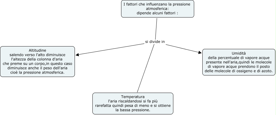 Questa Cmap, creata con IHMC CmapTools, contiene informazioni relative a: i fattori dell'aria atmosferica, I fattori che influenzano la pressione atmosferica: dipende alcuni fattori : si divide in Umidità della percentuale di vapore acque presente nell'aria,quindi le molecole di vapore acque prendono il posto delle molecole di ossigeno e di azoto., I fattori che influenzano la pressione atmosferica: dipende alcuni fattori : si divide in Temperatura l'aria riscaldandosi si fa più rarefatta quindi pesa di meno e si ottiene la bassa pressione., I fattori che influenzano la pressione atmosferica: dipende alcuni fattori : si divide in Altitudine salendo verso l'alto diminuisce l'altezza della colonna d'aria che preme su un corpo,in questo caso diminuisce anche il peso dell'aria cioè la pressione atmosferica.