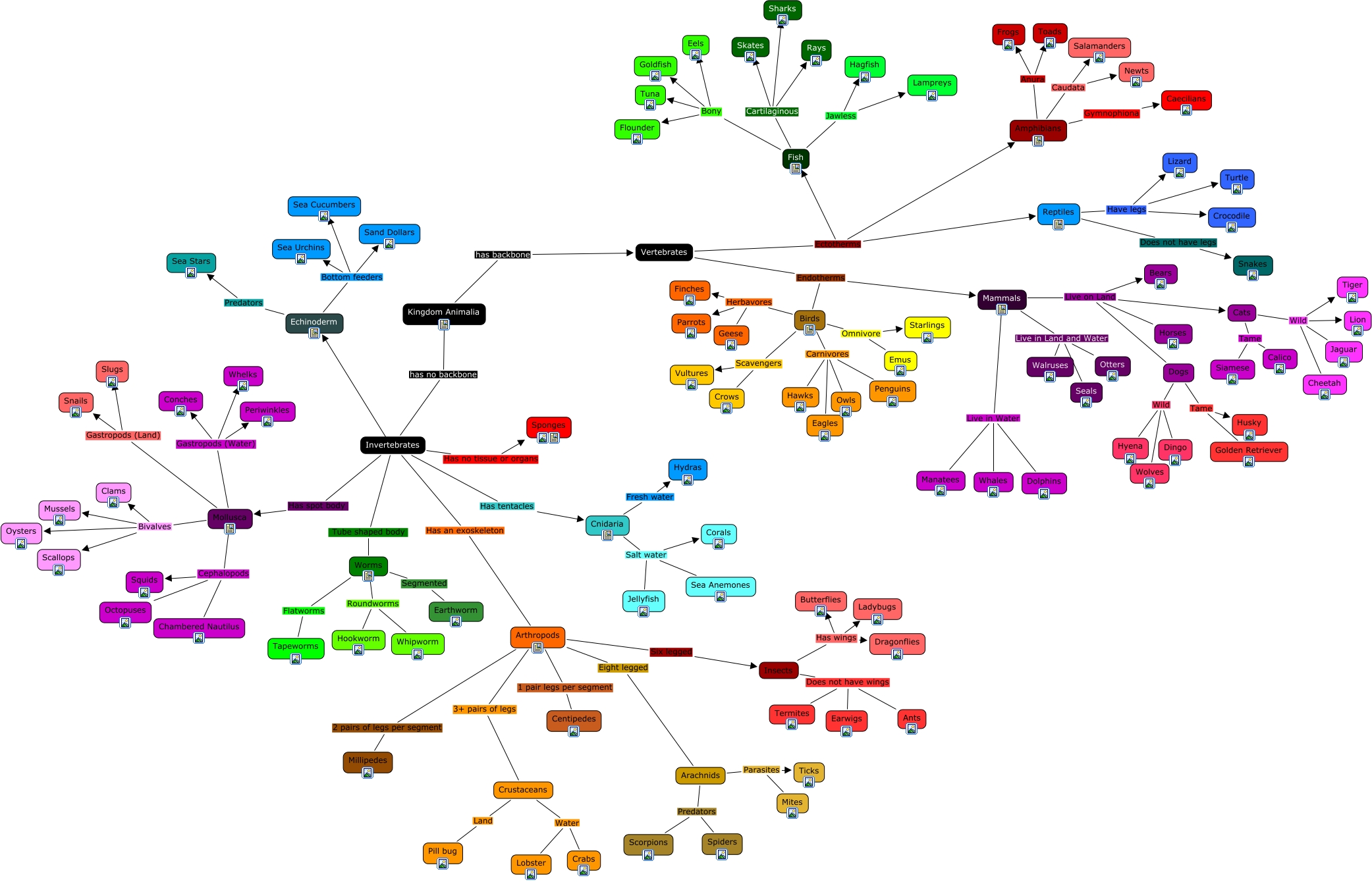 This Concept Map, created with IHMC CmapTools, has information related to: Animal Kingdom Katie Anderson, Vertebrates Endotherms Birds, Echinoderm Bottom feeders Sea Urchins, Dogs Tame Husky, Echinoderm Bottom feeders Sea Cucumbers, Reptiles Have legs Turtle, Kingdom Animalia has no backbone Invertebrates, Insects Has wings Ladybugs, Invertebrates Has no tissue or organs Sponges, Dogs Tame Golden Retriever, Fish Bony Eels, Insects Has wings Dragonflies, Mollusca Bivalves Mussels, Vertebrates Endotherms Mammals, Cats Wild Lion, Birds Omnivore Starlings, Insects Does not have wings Ants, Echinoderm Bottom feeders Sand Dollars, Dogs Wild Hyena, Mammals Live on Land Bears, Vertebrates Ectotherms Fish