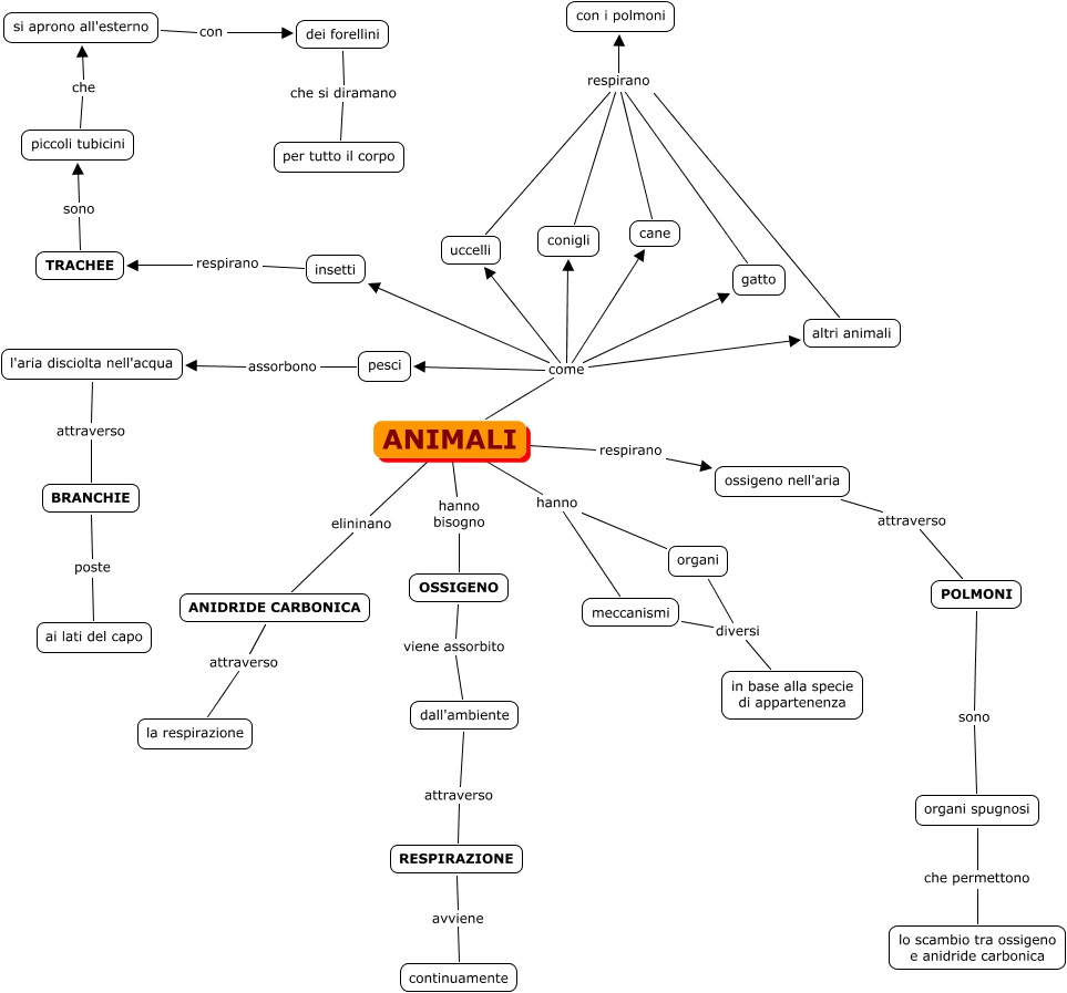 Questa Cmap, creata con IHMC CmapTools, contiene informazioni relative a: LA RESPIRAZIONE DEGLI ANIMALI, ANIDRIDE CARBONICA attraverso la respirazione, cane respirano con i polmoni, organi diversi in base alla specie di appartenenza, organi spugnosi che permettono lo scambio tra ossigeno e anidride carbonica, l'aria disciolta nell'acqua attraverso BRANCHIE, ossigeno nell'aria attraverso POLMONI, ANIMALI come conigli, RESPIRAZIONE avviene continuamente, dei forellini che si diramano per tutto il corpo, piccoli tubicini che si aprono all'esterno, TRACHEE sono piccoli tubicini, gatto respirano con i polmoni, ANIMALI come gatto, si aprono all'esterno con dei forellini, ANIMALI elininano ANIDRIDE CARBONICA, meccanismi diversi in base alla specie di appartenenza, pesci assorbono l'aria disciolta nell'acqua, ANIMALI come cane, altri animali respirano con i polmoni, ANIMALI respirano ossigeno nell'aria