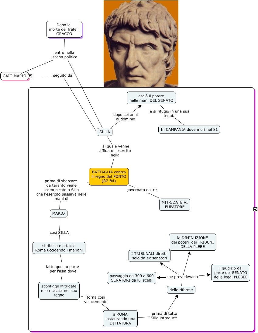 Questa Cmap, creata con IHMC CmapTools, contiene informazioni relative a: GAIO MARIO E SILLA (balzi), GAIO MARIO (eletto console nel 107 a.C.) entro nella politica romana grazie alle sue abilita di GUERRIERO, arruolò tutti i VOLONTARI per lo piu NULLATENENTI in cerca di una vita migliore, GUERRA CONTRO I CIMBRI E I TEUTONI (104-100) in cui sconfisse i secondi ad AQUAE SEXTIAE nel 102, sue abilita di GUERRIERO a lui fu infatti affidato il COMANDO dell' ESERCITO, il COMANDO dell' ESERCITO nella GUERRA GIUGURTINA (107-105), BATTAGLIA contro il regno del PONTO (87-84) governato dal re MITRIDATE VI EUPATORE, GUERRA GIUGURTINA (107-105) dato che l'esercito era esiguo arruolò tutti i VOLONTARI, a ROMA instaurando una DITTATURA prima di tutto Silla introduce delle riforme, i primi ai CAMPI RAUDII nel 101 fondò,cosi,poi LA GALLIA CISALPINA, il COMANDO dell' ESERCITO nella GUERRA SOCIALE (90-88), GUERRA GIUGURTINA (107-105) vinta senza nessun problema dai ROMANI, GUERRA CONTRO I CIMBRI E I TEUTONI (104-100) in cui sconfisse i primi ai CAMPI RAUDII nel 101, GUERRA GIUGURTINA (107-105) combattuta contro il regno della NUMIDIA governato da GIUGURTA, ROMANI che catturarono GIUGURTA e poi lo uccisero, lasciò il potere nelle mani DEL SENATO e si rifugio in una sua tenuta In CAMPANIA dove mori nel 81, i primi ai CAMPI RAUDII nel 101 fondò,cosi,poi LA GALLIA TRANSALPINA, GAIO MARIO (eletto console nel 107 a.C.) si mise a capo dei POPULARES, i secondi ad AQUAE SEXTIAE nel 102 fondò,cosi,poi LA GALLIA TRANSALPINA, Dopo la morte dei fratelli GRACCO entrò nella scena politica GAIO MARIO (eletto console nel 107 a.C.), GUERRA SOCIALE (90-88) fu una guerra CRUDELE che portò alla morte di numerosi uomini