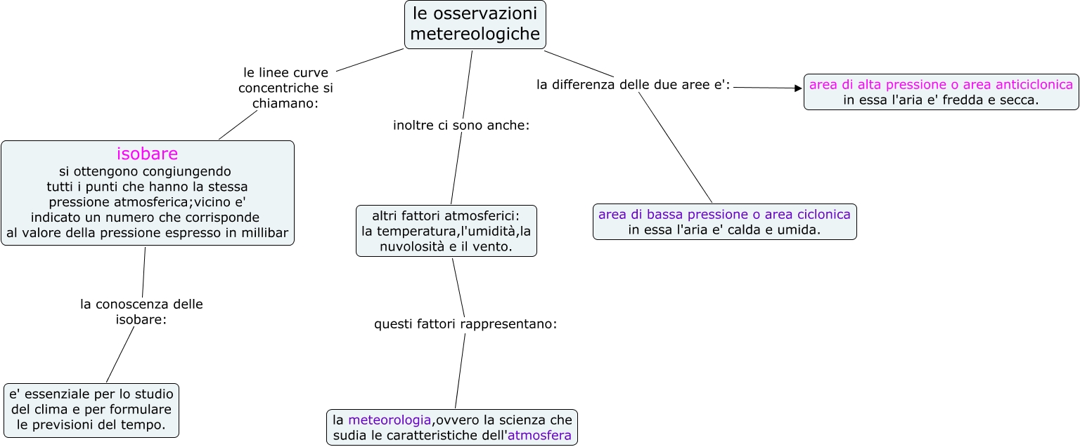 Questa Cmap, creata con IHMC CmapTools, contiene informazioni relative a: OSSERVAZIOI METEREOLOGICHE mati, le osservazioni metereologiche inoltre ci sono anche: altri fattori atmosferici: la temperatura,l'umidità,la nuvolosità e il vento., isobare si ottengono congiungendo tutti i punti che hanno la stessa pressione atmosferica;vicino e' indicato un numero che corrisponde al valore della pressione espresso in millibar la conoscenza delle isobare: e' essenziale per lo studio del clima e per formulare le previsioni del tempo., le osservazioni metereologiche la differenza delle due aree e': area di bassa pressione o area ciclonica in essa l'aria e' calda e umida., le osservazioni metereologiche le linee curve concentriche si chiamano: isobare si ottengono congiungendo tutti i punti che hanno la stessa pressione atmosferica;vicino e' indicato un numero che corrisponde al valore della pressione espresso in millibar, le osservazioni metereologiche la differenza delle due aree e': area di alta pressione o area anticiclonica in essa l'aria e' fredda e secca., altri fattori atmosferici: la temperatura,l'umidità,la nuvolosità e il vento. questi fattori rappresentano: la meteorologia,ovvero la scienza che sudia le caratteristiche dell'atmosfera