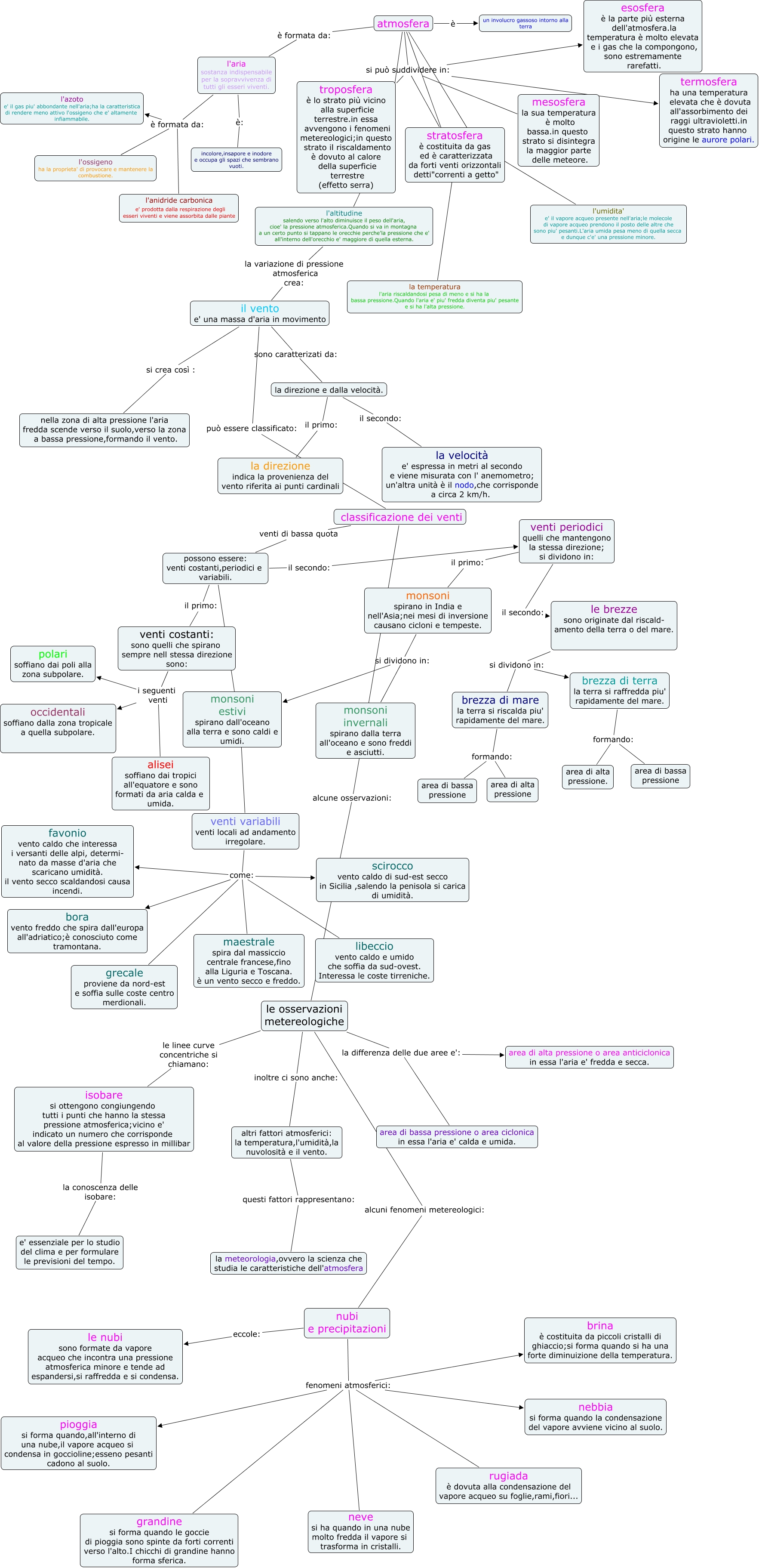 Questa Cmap, creata con IHMC CmapTools, contiene informazioni relative a: mappa intera del capitolo atmosfera mati, atmosfera ???? l'altitudine salendo verso l'alto diminuisce il peso dell'aria, cioe' la pressione atmosferica.Quando si va in montagna a un certo punto si tappano le orecchie perche'la pressione che e' all'interno dell'orecchio e' maggiore di quella esterna., le osservazioni metereologiche alcuni fenomeni metereologici: nubi e precipitazioni, nubi e precipitazioni fenomeni atmosferici: neve si ha quando in una nube molto fredda il vapore si trasforma in cristalli., il vento e' una massa d'aria in movimento si crea così : nella zona di alta pressione l'aria fredda scende verso il suolo,verso la zona a bassa pressione,formando il vento., l'aria sostanza indispensabile per la sopravvivenza di tutti gli esseri viventi. è formata da: l'anidride carbonica e' prodotta dalla respirazione degli esseri viventi e viene assorbita dalle piante, l'aria sostanza indispensabile per la sopravvivenza di tutti gli esseri viventi. è: incolore,insapore e inodore e occupa gli spazi che sembrano vuoti., atmosfera si può suddividere in: termosfera ha una temperatura elevata che è dovuta all'assorbimento dei raggi ultravioletti.in questo strato hanno origine le aurore polari., altri fattori atmosferici: la temperatura,l'umidità,la nuvolosità e il vento. questi fattori rappresentano: la meteorologia,ovvero la scienza che studia le caratteristiche dell'atmosfera, nubi e precipitazioni eccole: le nubi sono formate da vapore acqueo che incontra una pressione atmosferica minore e tende ad espandersi,si raffredda e si condensa., classificazione dei venti venti di bassa quota possono essere: venti costanti,periodici e variabili., l'aria sostanza indispensabile per la sopravvivenza di tutti gli esseri viventi. è formata da: l'ossigeno ha la proprieta' di provocare e mantenere la combustione., monsoni spirano in India e nell'Asia;nei mesi di inversione causano cicloni e tempeste. si dividono in: monsoni invernali spirano dalla terra all'oceano e sono freddi e asciutti., atmosfera ???? la temperatura l'aria riscaldandosi pesa di meno e si ha la bassa pressione.Quando l'aria e' piu' fredda diventa piu' pesante e si ha l'alta pressione., atmosfera è un involucro gassoso intorno alla terra, possono essere: venti costanti,periodici e variabili. il primo: venti costanti: sono quelli che spirano sempre nell stessa direzione sono:, le brezze sono originate dal riscald- amento della terra o del mare. si dividono in: brezza di terra la terra si raffredda piu' rapidamente del mare., nubi e precipitazioni fenomeni atmosferici: brina è costituita da piccoli cristalli di ghiaccio;si forma quando si ha una forte diminuizione della temperatura., le osservazioni metereologiche le linee curve concentriche si chiamano: isobare si ottengono congiungendo tutti i punti che hanno la stessa pressione atmosferica;vicino e' indicato un numero che corrisponde al valore della pressione espresso in millibar, atmosfera si può suddividere in: mesosfera la sua temperatura è molto bassa.in questo strato si disintegra la maggior parte delle meteore., la direzione e dalla velocità. il secondo: la velocità e' espressa in metri al secondo e viene misurata con l' anemometro; un'altra unità è il nodo,che corrisponde a circa 2 km/h.
