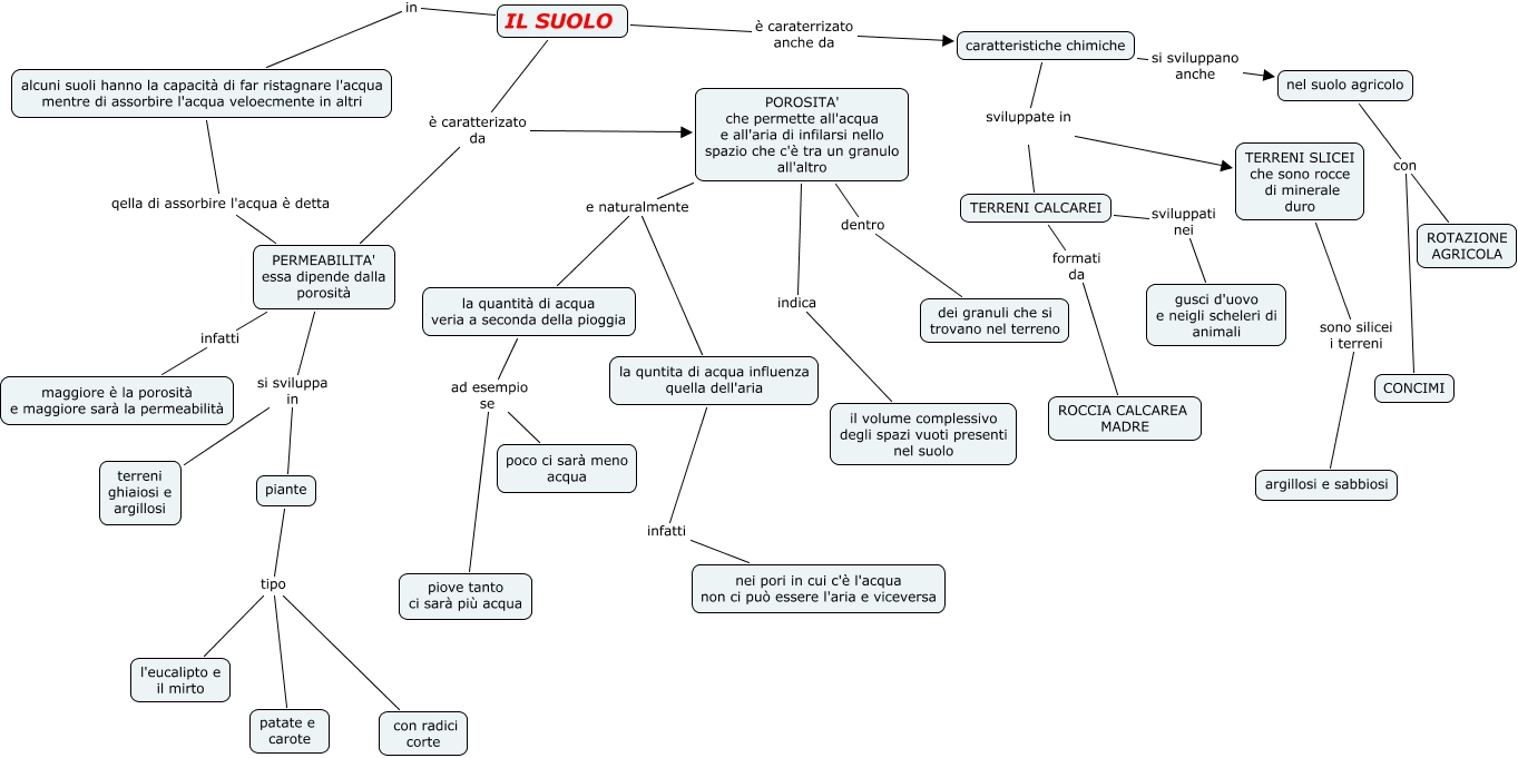 Questa Cmap, creata con IHMC CmapTools, contiene informazioni relative a: IL SUOLO, alcuni suoli hanno la capacità di far ristagnare l'acqua mentre di assorbire l'acqua veloecmente in altri qella di assorbire l'acqua è detta PERMEABILITA' essa dipende dalla porosità, IL SUOLO in alcuni suoli hanno la capacità di far ristagnare l'acqua mentre di assorbire l'acqua veloecmente in altri, piante tipo con radici corte, caratteristiche chimiche si sviluppano anche nel suolo agricolo, TERRENI CALCAREI sviluppati nei gusci d'uovo e neigli scheleri di animali, IL SUOLO è caratterizato da POROSITA' che permette all'acqua e all'aria di infilarsi nello spazio che c'è tra un granulo all'altro, TERRENI SLICEI che sono rocce di minerale duro sono silicei i terreni argillosi e sabbiosi, piante tipo patate e carote, POROSITA' che permette all'acqua e all'aria di infilarsi nello spazio che c'è tra un granulo all'altro e naturalmente la quantità di acqua veria a seconda della pioggia, PERMEABILITA' essa dipende dalla porosità infatti maggiore è la porosità e maggiore sarà la permeabilità, la quantità di acqua veria a seconda della pioggia ad esempio se poco ci sarà meno acqua, POROSITA' che permette all'acqua e all'aria di infilarsi nello spazio che c'è tra un granulo all'altro e naturalmente la quntita di acqua influenza quella dell'aria, IL SUOLO è caratterizato da PERMEABILITA' essa dipende dalla porosità, la quntita di acqua influenza quella dell'aria infatti nei pori in cui c'è l'acqua non ci può essere l'aria e viceversa, PERMEABILITA' essa dipende dalla porosità si sviluppa in piante, POROSITA' che permette all'acqua e all'aria di infilarsi nello spazio che c'è tra un granulo all'altro indica il volume complessivo degli spazi vuoti presenti nel suolo, caratteristiche chimiche sviluppate in TERRENI CALCAREI, TERRENI CALCAREI formati da ROCCIA CALCAREA MADRE, nel suolo agricolo con ROTAZIONE AGRICOLA, la quantità di acqua veria a seconda della pioggia ad esempio se piove tanto ci sarà più acqua