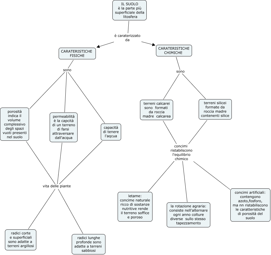 Questa Cmap, creata con IHMC CmapTools, contiene informazioni relative a: il suolo maria, CARATERISTICHE FISICHE sono porosità indica il volume complessivo degli spazi vuoti presenti nel suolo, permeabilità è la capcità di un terreno di farsi attraversare dall'acqua vita delle piante radici lunghe profonde sono adatte a terreni sabbiosi, permeabilità è la capcità di un terreno di farsi attraversare dall'acqua vita delle piante radici corte e superficiali sono adatte a terreni argillosi, terreni calcarei sono formati da roccia madre calcarea concimi ristabilscono l'equilibrio chimico la rotazione agraria: consiste nell'alternare ogni anno colture diverse sullo stesso tapezzamento, terreni silicei formate da roccia madre contenenti silice concimi ristabilscono l'equilibrio chimico letame: concime naturale ricco di sostanze nutritive rende il terreno soffice e poroso, terreni calcarei sono formati da roccia madre calcarea concimi ristabilscono l'equilibrio chimico concimi artificiali: contengono azoto,fosforo, ma nn ristabiliscono le caratteristiche di porosità del suolo, porosità indica il volume complessivo degli spazi vuoti presenti nel suolo vita delle piante radici corte e superficiali sono adatte a terreni argillosi, capacità di tenere l'aqcua vita delle piante radici lunghe profonde sono adatte a terreni sabbiosi, IL SUOLO è la parte più superficiale della litosfera è caraterizzato da CARATERISTICHE CHIMICHE, IL SUOLO è la parte più superficiale della litosfera è caraterizzato da CARATERISTICHE FISICHE, CARATERISTICHE CHIMICHE sono terreni calcarei sono formati da roccia madre calcarea, terreni calcarei sono formati da roccia madre calcarea concimi ristabilscono l'equilibrio chimico letame: concime naturale ricco di sostanze nutritive rende il terreno soffice e poroso, CARATERISTICHE FISICHE sono capacità di tenere l'aqcua, terreni silicei formate da roccia madre contenenti silice concimi ristabilscono l'equilibrio chimico la rotazione agraria: consiste nell'alternare ogni anno colture diverse sullo stesso tapezzamento, capacità di tenere l'aqcua vita delle piante radici corte e superficiali sono adatte a terreni argillosi, CARATERISTICHE CHIMICHE sono terreni silicei formate da roccia madre contenenti silice, CARATERISTICHE FISICHE sono permeabilità è la capcità di un terreno di farsi attraversare dall'acqua, terreni silicei formate da roccia madre contenenti silice concimi ristabilscono l'equilibrio chimico concimi artificiali: contengono azoto,fosforo, ma nn ristabiliscono le caratteristiche di porosità del suolo, porosità indica il volume complessivo degli spazi vuoti presenti nel suolo vita delle piante radici lunghe profonde sono adatte a terreni sabbiosi