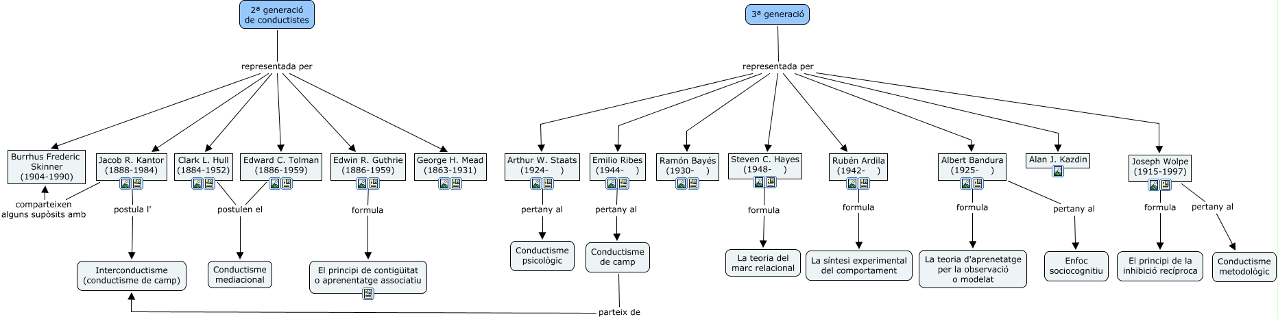Este Cmap, tiene información relacionada con: conductisme, 3ª generació representada per Arthur W. Staats (1924- ), 3ª generació representada per Alan J. Kazdin, Conductisme de camp parteix de Interconductisme (conductisme de camp), 3ª generació representada per Emilio Ribes (1944- ), 3ª generació representada per Albert Bandura (1925- ), Albert Bandura (1925- ) pertany al Enfoc sociocognitiu, Rubén Ardila (1942- ) formula La síntesi experimental del comportament, Joseph Wolpe (1915-1997) formula El principi de la inhibició recíproca, Joseph Wolpe (1915-1997) pertany al Conductisme metodològic, 2ª generació de conductistes representada per Clark L. Hull (1884-1952), Jacob R. Kantor (1888-1984) postula l' Interconductisme (conductisme de camp), Arthur W. Staats (1924- ) pertany al Conductisme psicològic, Edward C. Tolman (1886-1959) postulen el Conductisme mediacional, Clark L. Hull (1884-1952) postulen el Conductisme mediacional, 2ª generació de conductistes representada per Edward C. Tolman (1886-1959), 2ª generació de conductistes representada per Burrhus Frederic Skinner (1904-1990), 3ª generació representada per Joseph Wolpe (1915-1997), 2ª generació de conductistes representada per Edwin R. Guthrie (1886-1959), 3ª generació representada per Steven C. Hayes (1948- ), 3ª generació representada per Rubén Ardila (1942- )
