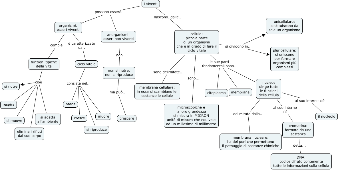 Questa Cmap, creata con IHMC CmapTools, contiene informazioni relative a: i viventi virginia pag.166-167, organismi: esseri viventi compie funzioni tipiche della vita, ciclo vitale consiste nel.. muore, non si nutre, non si riproduce ma può.. crescere, nucleo: dirige tutte le funzioni della cellula delimitato dalla.. membrana nucleare: ha dei pori che permettono il passaggio di sostanze chimiche, ciclo vitale consiste nel.. nasce, anorganismi: esseri non viventi non non si nutre, non si riproduce, ciclo vitale consiste nel.. si riproduce, funzioni tipiche della vita cioè elimina i rifiuti dal suo corpo, cellule: piccola parte di un organismi che è in grado di fare il ciclo vitale le sue parti fondamentali sono... membrana, nucleo: dirige tutte le funzioni della cellula al suo interno c'è il nucleolo, cellule: piccola parte di un organismi che è in grado di fare il ciclo vitale si dividono in.. unicellulare: costituiscono da sole un organismo, funzioni tipiche della vita cioè si muove, cellule: piccola parte di un organismi che è in grado di fare il ciclo vitale sono delimitate.. membrana cellulare: in essa si scambiano le sostanze le cellule, nucleo: dirige tutte le funzioni della cellula al suo interno c'è cromatina: formata da una sostanza, cromatina: formata da una sostanza detta... DNA: codice cifrato contenente tutte le informazioni sulla cellula, organismi: esseri viventi è caratterizzato da.. ciclo vitale, cellule: piccola parte di un organismi che è in grado di fare il ciclo vitale sono... microscopiche e la loro grandezza si misura in MICRON unità di misura che equivale ad un millesimo di millimetro, cellule: piccola parte di un organismi che è in grado di fare il ciclo vitale si dividono in.. pluricellulare: si uniscono per formare organismi più complessi, funzioni tipiche della vita cioè si nutre, funzioni tipiche della vita cioè si adatta all'ambiente