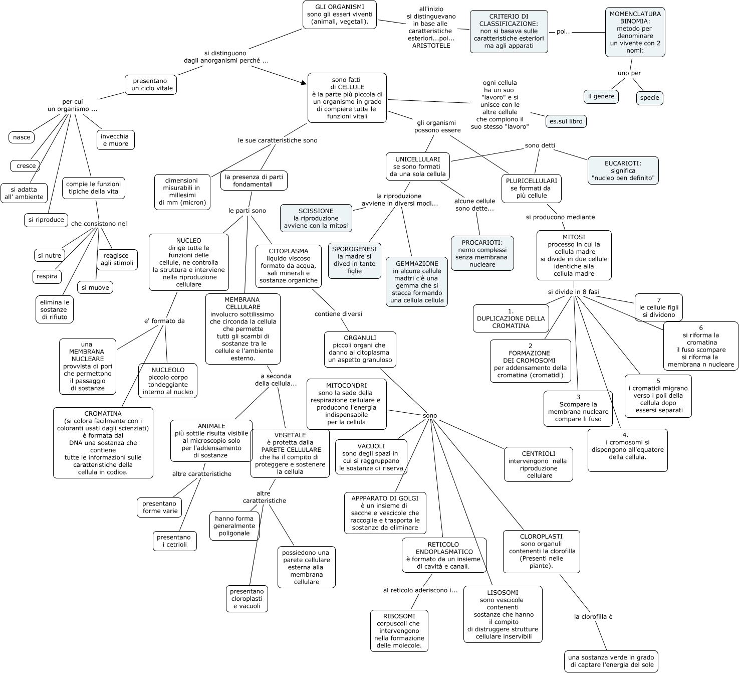 Questa Cmap, creata con IHMC CmapTools, contiene informazioni relative a: esseri viventi mappa virginia con quella del prof, ORGANULI piccoli organi che danno al citoplasma un aspetto granuloso sono RETICOLO ENDOPLASMATICO è formato da un insieme di cavità e canali., MITOSI processo in cui la cellula madre si divide in due cellule identiche alla cellula madre si divide in 8 fasi 3 Scompare la membrana nucleare compare li fuso, ANIMALE più sottile risulta visibile al microscopio solo per l'addensamento di sostanze altre caratteristiche presentano i cetrioli, GLI ORGANISMI sono gli esseri viventi (animali, vegetali). si distinguono dagli anorganismi perché ... sono fatti di CELLULE è la parte più piccola di un organismo in grado di compiere tutte le funzioni vitali, GLI ORGANISMI sono gli esseri viventi (animali, vegetali). si distinguono dagli anorganismi perché ... presentano un ciclo vitale, compie le funzioni tipiche della vita che consistono nel reagisce agli stimoli, NUCLEO dirige tutte le funzioni delle cellule, ne controlla la struttura e interviene nella riproduzione cellulare e' formato da una MEMBRANA NUCLEARE provvista di pori che permettono il passaggio di sostanze, CRITERIO DI CLASSIFICAZIONE: non si basava sulle caratteristiche esteriori ma agli apparati poi.. MOMENCLATURA BINOMIA: metodo per denominare un vivente con 2 nomi:, ORGANULI piccoli organi che danno al citoplasma un aspetto granuloso sono LISOSOMI sono vescicole contenenti sostanze che hanno il compito di distruggere strutture cellulare inservibili, MITOSI processo in cui la cellula madre si divide in due cellule identiche alla cellula madre si divide in 8 fasi 1. DUPLICAZIONE DELLA CROMATINA, PLURICELLULARI se formati da più cellule si producono mediante MITOSI processo in cui la cellula madre si divide in due cellule identiche alla cellula madre, MEMBRANA CELLULARE involucro sottilissimo che circonda la cellula che permette tutti gli scambi di sostanze tra le cellule e l'ambiente esterno. a seconda della cellula... ANIMALE più sottile risulta visibile al microscopio solo per l'addensamento di sostanze, UNICELLULARI se sono formati da una sola cellula la riproduzione avviene in diversi modi... SCISSIONE la riproduzione avviene con la mitosi, UNICELLULARI se sono formati da una sola cellula sono detti EUCARIOTI: significa "nucleo ben definito", MITOSI processo in cui la cellula madre si divide in due cellule identiche alla cellula madre si divide in 8 fasi 7 le cellule figli si dividono, MITOSI processo in cui la cellula madre si divide in due cellule identiche alla cellula madre si divide in 8 fasi 4. i cromosomi si dispongono all'equatore della cellula., NUCLEO dirige tutte le funzioni delle cellule, ne controlla la struttura e interviene nella riproduzione cellulare e' formato da CROMATINA (si colora facilmente con i coloranti usati dagli scienziati) è formata dal DNA una sostanza che contiene tutte le informazioni sulle caratteristiche della cellula in codice., MEMBRANA CELLULARE involucro sottilissimo che circonda la cellula che permette tutti gli scambi di sostanze tra le cellule e l'ambiente esterno. a seconda della cellula... VEGETALE è protetta dalla PARETE CELLULARE che ha il compito di proteggere e sostenere la cellula, UNICELLULARI se sono formati da una sola cellula alcune cellule sono dette... PROCARIOTI: nemo complessi senza membrana nucleare, VEGETALE è protetta dalla PARETE CELLULARE che ha il compito di proteggere e sostenere la cellula altre caratteristiche presentano cloroplasti e vacuoli