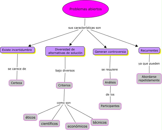 Este Cmap, tiene información relacionada con: Buenos problemas, Generan controversia se requiere Análisis, Problemas abiertos sus características son Recurrentes, Recurrentes ya que pueden Abordarse repetidamente, Criterios como son económicos, Problemas abiertos sus características son Generan controversia, Criterios como son éticos, Criterios como son científicos, Existe incertidumbre se carece de Certeza, Análisis de los Participantes, Problemas abiertos sus características son Existe incertidumbre, Criterios como son técnicos, Problemas abiertos sus características son Diversidad de alternativas de solución, Diversidad de alternativas de solución bajo diversos Criterios