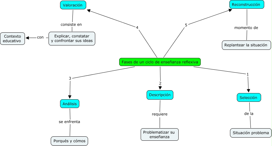 Este Cmap, tiene información relacionada con: Fases ens. reflexiva, Selección de la Situación problema, Fases de un ciclo de enseñanza reflexiva 1 Selección, Reconstrucción momento de Replantear la situación, Fases de un ciclo de enseñanza reflexiva 2 Descripción, Valoración consiste en Explicar, constatar y confrontar sus ideas, Fases de un ciclo de enseñanza reflexiva 4 Valoración, Explicar, constatar y confrontar sus ideas con Contexto educativo, Fases de un ciclo de enseñanza reflexiva 3 Análisis, Análisis se enfrenta Porqués y cómos, Fases de un ciclo de enseñanza reflexiva 5 Reconstrucción, Descripción requiere Problematizar su enseñanza