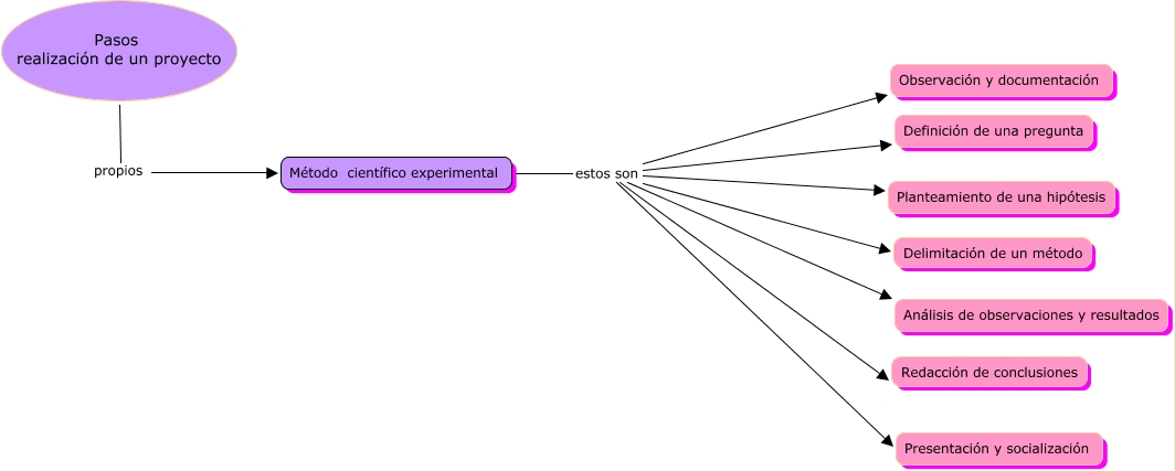 Este Cmap, tiene información relacionada con: pasos realización de proyecto, Método científico experimental estos son Definición de una pregunta, Método científico experimental estos son Redacción de conclusiones, Método científico experimental estos son Observación y documentación, Pasos realización de un proyecto propios Método científico experimental, Método científico experimental estos son Análisis de observaciones y resultados, Método científico experimental estos son Presentación y socialización, Método científico experimental estos son Delimitación de un método, Método científico experimental estos son Planteamiento de una hipótesis