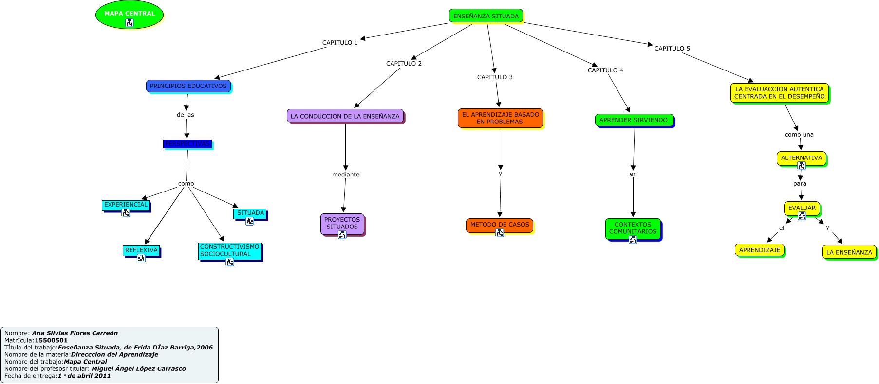 Este Cmap, tiene información relacionada con: mapa central a color e identificacion, ENSEÑANZA SITUADA CAPITULO 5 LA EVALUACCION AUTENTICA CENTRADA EN EL DESEMPEÑO, PERSPECTIVAS como CONSTRUCTIVISMO SOCIOCULTURAL, ENSEÑANZA SITUADA CAPITULO 4 APRENDER SIRVIENDO, EVALUAR y LA ENSEÑANZA, ALTERNATIVA para EVALUAR, ENSEÑANZA SITUADA CAPITULO 1 PRINCIPIOS EDUCATIVOS, PERSPECTIVAS como REFLEXIVA, LA CONDUCCION DE LA ENSEÑANZA mediante PROYECTOS SITUADOS, APRENDER SIRVIENDO en CONTEXTOS COMUNITARIOS, EL APRENDIZAJE BASADO EN PROBLEMAS y METODO DE CASOS, PRINCIPIOS EDUCATIVOS de las PERSPECTIVAS, PERSPECTIVAS como EXPERIENCIAL, PERSPECTIVAS como REFLEXIVA, EVALUAR el APRENDIZAJE, PERSPECTIVAS como SITUADA, ENSEÑANZA SITUADA CAPITULO 3 EL APRENDIZAJE BASADO EN PROBLEMAS, ENSEÑANZA SITUADA CAPITULO 2 LA CONDUCCION DE LA ENSEÑANZA, LA EVALUACCION AUTENTICA CENTRADA EN EL DESEMPEÑO como una ALTERNATIVA
