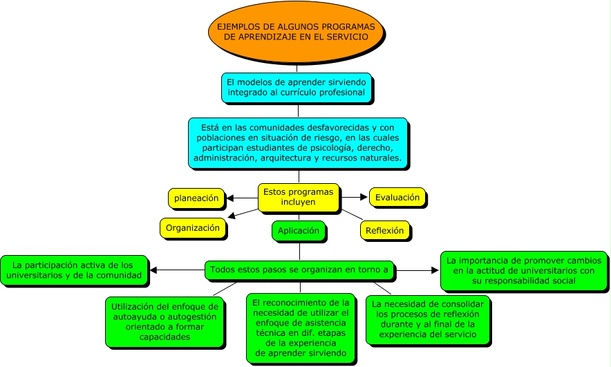Este Cmap, tiene información relacionada con: aprendizaje serv, El modelos de aprender sirviendo integrado al currículo profesional ???? Está en las comunidades desfavorecidas y con poblaciones en situación de riesgo, en las cuales participan estudiantes de psicología, derecho, administración, arquitectura y recursos naturales., Aplicación ???? Todos estos pasos se organizan en torno a, Todos estos pasos se organizan en torno a ???? Utilización del enfoque de autoayuda o autogestión orientado a formar capacidades, Estos programas incluyen ???? Aplicación, Todos estos pasos se organizan en torno a ???? El reconocimiento de la necesidad de utilizar el enfoque de asistencia técnica en dif. etapas de la experiencia de aprender sirviendo, Estos programas incluyen ???? Evaluación, Estos programas incluyen pl planeación, Todos estos pasos se organizan en torno a ???? La importancia de promover cambios en la actitud de universitarios con su responsabilidad social, Todos estos pasos se organizan en torno a ???? La necesidad de consolidar los procesos de reflexión durante y al final de la experiencia del servicio, Estos programas incluyen ???? Organización, Estos programas incluyen ???? Reflexión, EJEMPLOS DE ALGUNOS PROGRAMAS DE APRENDIZAJE EN EL SERVICIO ???? El modelos de aprender sirviendo integrado al currículo profesional, Está en las comunidades desfavorecidas y con poblaciones en situación de riesgo, en las cuales participan estudiantes de psicología, derecho, administración, arquitectura y recursos naturales. ???? Estos programas incluyen, Todos estos pasos se organizan en torno a ???? La participación activa de los universitarios y de la comunidad