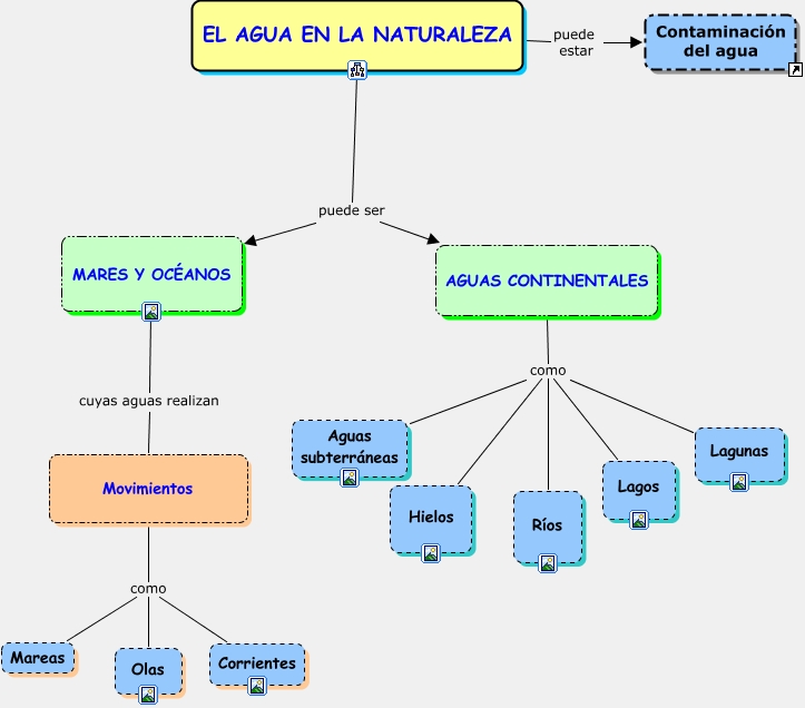 Este Cmap, tiene información relacionada con: agua el el paisaje, MARES Y OCÉANOS cuyas aguas realizan Movimientos, AGUAS CONTINENTALES como Lagos, AGUAS CONTINENTALES como Hielos, Movimientos como Mareas, EL AGUA EN LA NATURALEZA puede ser MARES Y OCÉANOS, Movimientos como Corrientes, EL AGUA EN LA NATURALEZA puede ser AGUAS CONTINENTALES, Movimientos como Olas, AGUAS CONTINENTALES como Ríos, AGUAS CONTINENTALES como Lagunas, EL AGUA EN LA NATURALEZA puede estar Contaminación del agua, AGUAS CONTINENTALES como Aguas subterráneas