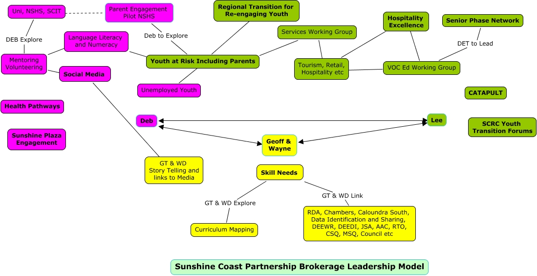 This Concept Map, created with IHMC CmapTools, has information related to: YSCDG mapping, Mentoring Volunteering ???? Language Literacy and Numeracy, Youth at Risk Including Parents ???? Services Working Group, Uni, NSHS, SCIT ???? Parent Engagement Pilot NSHS, VOC Ed Working Group ???? Hospitality Excellence, Social Media ???? Mentoring Volunteering, Geoff & Wayne ???? Lee, Youth at Risk Including Parents ???? Language Literacy and Numeracy, Social Media ???? ????, Tourism, Retail, Hospitality etc ???? Hospitality Excellence, Skill Needs GT & WD Explore Curriculum Mapping, Regional Transition for Re-engaging Youth ???? Youth at Risk Including Parents, Lee ???? Deb, Parent Engagement Pilot NSHS Deb to Explore Youth at Risk Including Parents, Mentoring Volunteering DEB Explore Uni, NSHS, SCIT, VOC Ed Working Group ???? Tourism, Retail, Hospitality etc, Geoff & Wayne ???? Deb, Skill Needs GT & WD Link RDA, Chambers, Caloundra South, Data Identification and Sharing, DEEWR, DEEDI, JSA, AAC, RTO, CSQ, MSQ, Council etc, Senior Phase Network DET to Lead VOC Ed Working Group, Youth at Risk Including Parents ???? Unemployed Youth, Services Working Group ???? Tourism, Retail, Hospitality etc