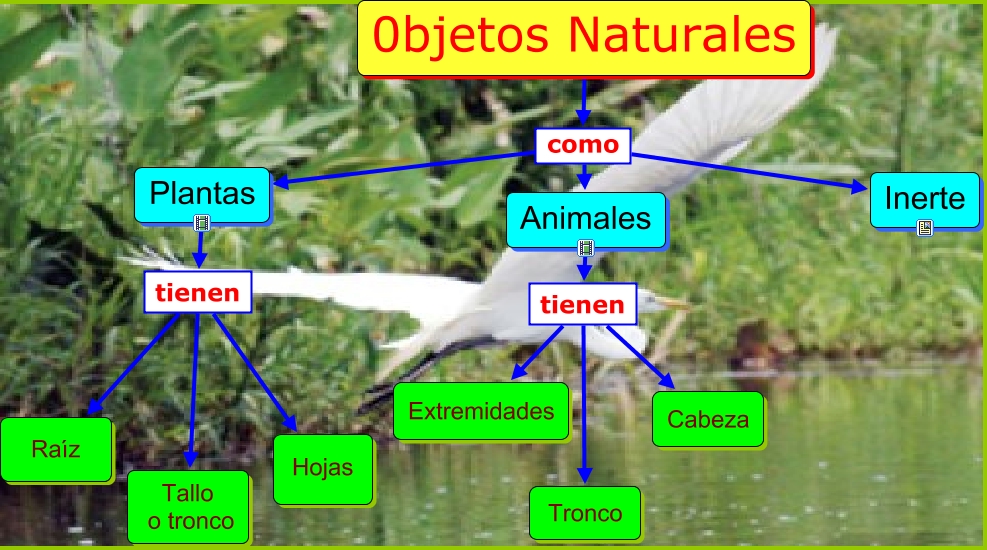 Este Cmap, tiene información relacionada con: Objetos naturales, Plantas tienen Raíz, 0bjetos Naturales como Plantas, 0bjetos Naturales como Animales, Animales tienen Cabeza, Animales tienen Extremidades, Animales tienen Tronco, Plantas tienen Hojas, Plantas tienen Tallo o tronco, 0bjetos Naturales como Inerte