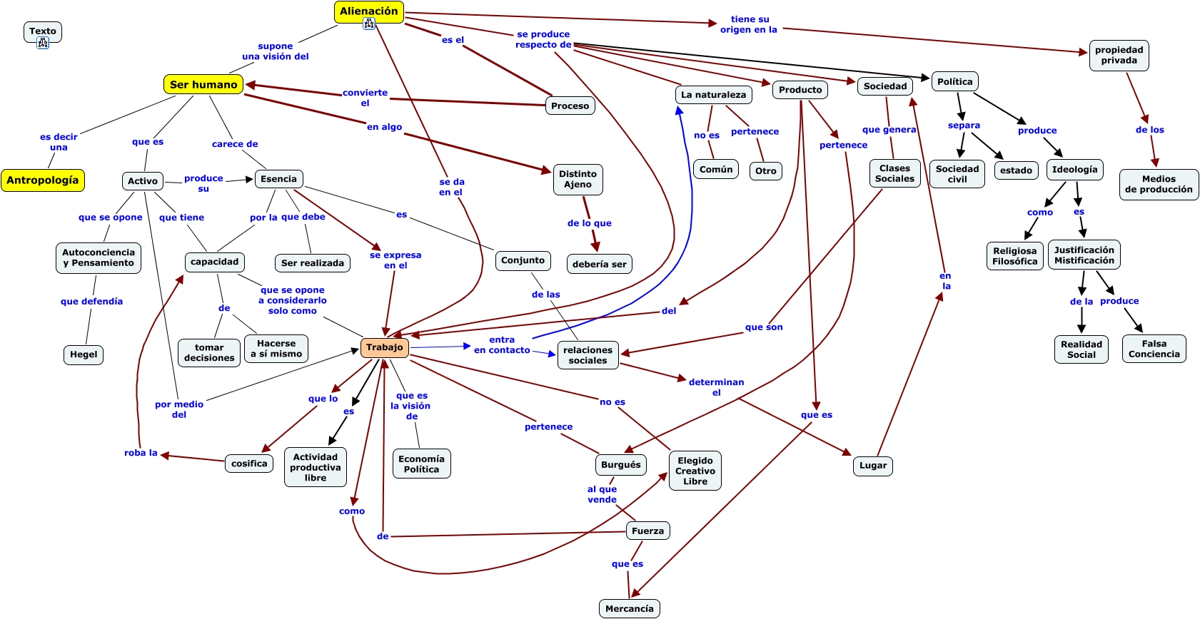Este Cmap, tiene información relacionada con: Marx_antropologia_alienacion, Política separa estado, Activo por medio del Trabajo, Proceso convierte el Ser humano, Trabajo entra en contacto relaciones sociales, Alienación es el Proceso, Alienación se produce respecto de La naturaleza, Esencia es Conjunto, Activo produce su Esencia, Activo que se opone Autoconciencia y Pensamiento, Ideología es Justificación Mistificación, Distinto Ajeno de lo que debería ser, La naturaleza no es Común, Ser humano es decir una Antropología, Alienación supone una visión del Ser humano, Lugar en la Sociedad, capacidad que se opone a considerarlo solo como Trabajo, capacidad de Hacerse a sí mismo, Trabajo es Actividad productiva libre, Autoconciencia y Pensamiento que defendía Hegel, Trabajo como Elegido Creativo Libre