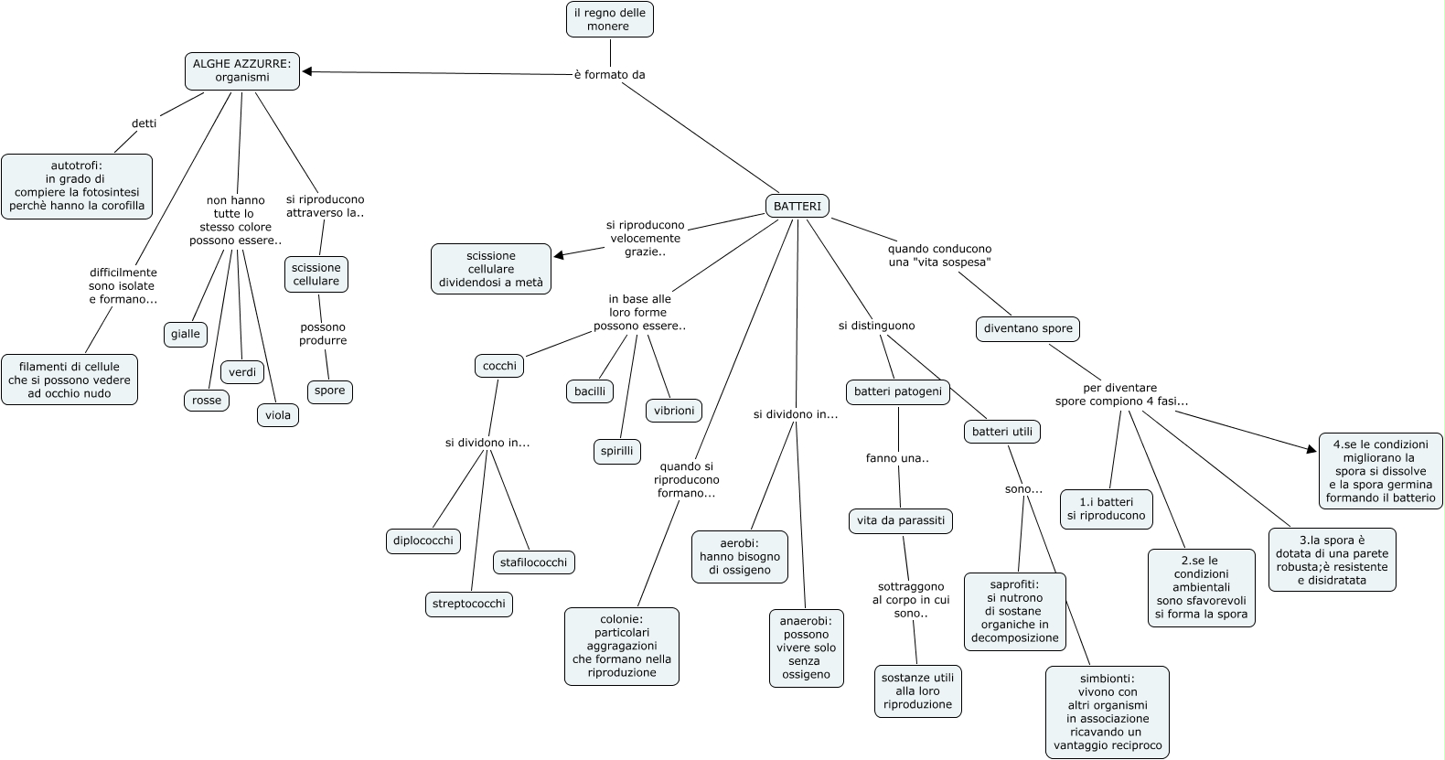 Questa Cmap, creata con IHMC CmapTools, contiene informazioni relative a: i batteri e le alghe azzurre, BATTERI in base alle loro forme possono essere.. bacilli, ALGHE AZZURRE: organismi difficilmente sono isolate e formano... filamenti di cellule che si possono vedere ad occhio nudo, ALGHE AZZURRE: organismi non hanno tutte lo stesso colore possono essere.. rosse, BATTERI quando conducono una "vita sospesa" diventano spore, BATTERI si dividono in... aerobi: hanno bisogno di ossigeno, cocchi si dividono in... stafilococchi, ALGHE AZZURRE: organismi detti autotrofi: in grado di compiere la fotosintesi perchè hanno la corofilla, BATTERI quando si riproducono formano... colonie: particolari aggragazioni che formano nella riproduzione, BATTERI in base alle loro forme possono essere.. vibrioni, diventano spore per diventare spore compiono 4 fasi... 2.se le condizioni ambientali sono sfavorevoli si forma la spora, cocchi si dividono in... streptococchi, ALGHE AZZURRE: organismi non hanno tutte lo stesso colore possono essere.. verdi, diventano spore per diventare spore compiono 4 fasi... 4.se le condizioni migliorano la spora si dissolve e la spora germina formando il batterio, vita da parassiti sottraggono al corpo in cui sono.. sostanze utili alla loro riproduzione, BATTERI si riproducono velocemente grazie.. scissione cellulare dividendosi a metà, cocchi si dividono in... diplococchi, il regno delle monere è formato da ALGHE AZZURRE: organismi, scissione cellulare possono produrre spore, ALGHE AZZURRE: organismi non hanno tutte lo stesso colore possono essere.. gialle, diventano spore per diventare spore compiono 4 fasi... 1.i batteri si riproducono