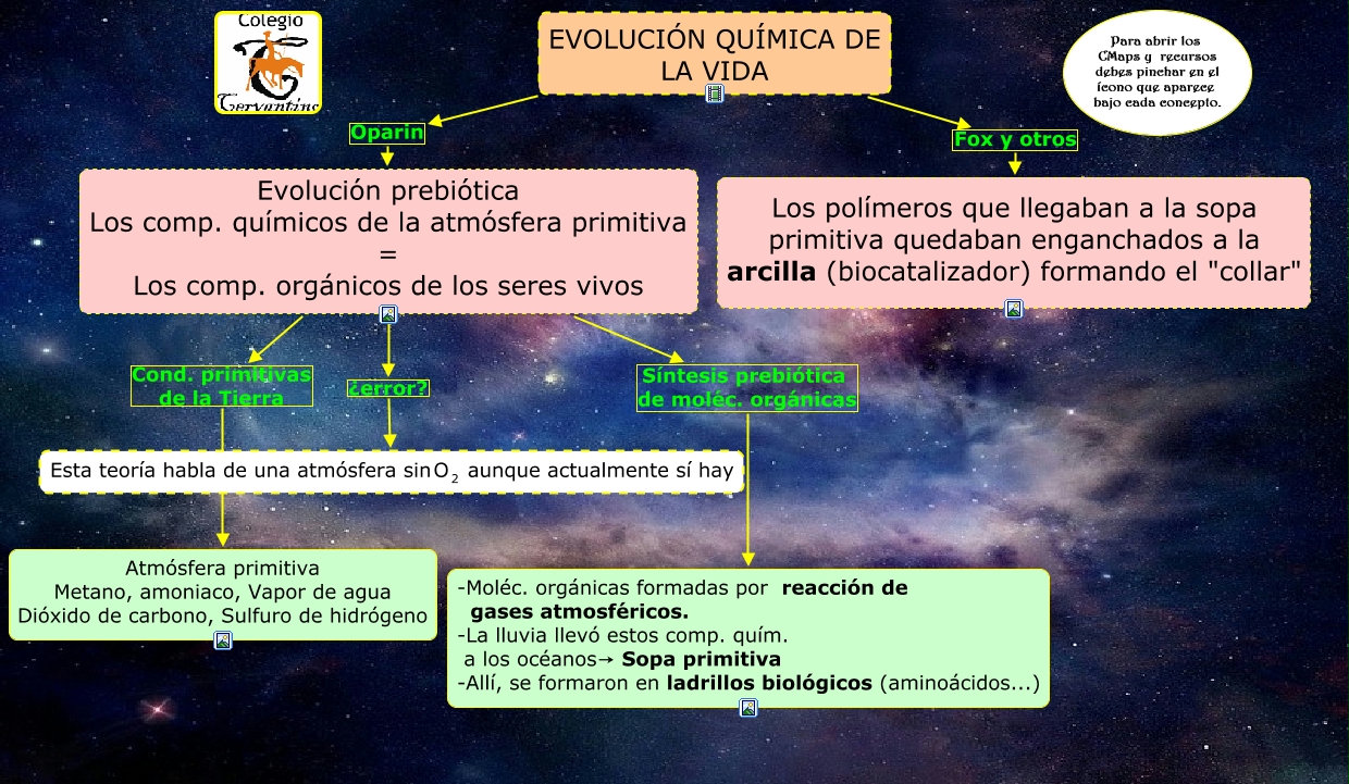 Este Cmap, tiene información relacionada con: Evolución Química, Evolución prebiótica Los comp. químicos de la atmósfera primitiva = Los comp. orgánicos de los seres vivos Síntesis prebiótica de moléc. orgánicas -Moléc. orgánicas formadas por reacción de gases atmosféricos. -La lluvia llevó estos comp. quím. a los océanos→ Sopa primitiva -Allí, se formaron en ladrillos biológicos (aminoácidos...), EVOLUCIÓN QUÍMICA DE LA VIDA Oparin Evolución prebiótica Los comp. químicos de la atmósfera primitiva = Los comp. orgánicos de los seres vivos, Evolución prebiótica Los comp. químicos de la atmósfera primitiva = Los comp. orgánicos de los seres vivos Cond. primitivas de la Tierra Atmósfera primitiva Metano, amoniaco, Vapor de agua Dióxido de carbono, Sulfuro de hidrógeno, Evolución prebiótica Los comp. químicos de la atmósfera primitiva = Los comp. orgánicos de los seres vivos ¿error? <math xmlns="http://www.w3.org/1998/Math/MathML"> <mrow> <mtext> Esta teoría habla de una atmósfera sin </mtext> <mmultiscripts> <mtext> O </mtext> <mtext> 2 </mtext> <none/> </mmultiscripts> <mtext> aunque actualmente sí hay </mtext> </mrow> </math>, EVOLUCIÓN QUÍMICA DE LA VIDA Fox y otros Los polímeros que llegaban a la sopa primitiva quedaban enganchados a la arcilla (biocatalizador) formando el "collar"