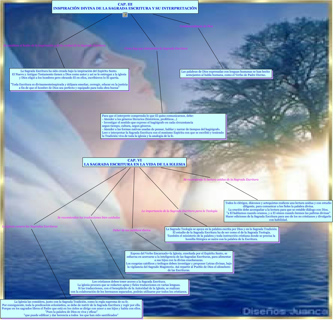Este Cmap, tiene información relacionada con: Sagradas Escrituras, Irantzu Arruti, CAP. III INSPIRACIÓN DIVINA DE LA SAGRADA ESCRITURA Y SU INTERPRETACIÓN Se establece el hecho de la inspiración y de la verdad de la Sagrada Escritura La Sagrada Escritura ha sido creada bajo la inspiración del Espíritu Santo. El Nuevo y Antiguo Testamento tienen a Dios como autor y así se le entregan a la iglesia y Dios eligió a los hombres pero obrando El en ellos, escribieron lo El quería. "Toda Escritura es divinamenteinspirada y útilpara enseñar, corregir, educar en la justicia a fin de que el hombre de Dios sea perfecto y equipado para toda obra buena", CAP. III INSPIRACIÓN DIVINA DE LA SAGRADA ESCRITURA Y SU INTERPRETACIÓN Como hay que interpretar la Sagrada Escritura Para que el interprete comprenda lo que El quiso comunicarnos, debe: - Atender a los géneros literarios (históricos, proféticos...) - Investigar el sentido que expreso el hagiógrafo en cada circunstancia segun tiempo, cultura, segun géneros. - Atender a las formas nativas usadas de pensar, hablar y narrar de tiempos del hagiógrafo. Leer e interpretar la Sagrada Escritura con el mmismo Espíritu con que se escribió y teniendo la Tradición viva de toda la iglesia y la analogía de la fe., CAP. VI LA SAGRADA ESCRITURA EN LA VIDA DE LA IGLESIA La Iglesia venera las Sagradas Escrituras La Iglesia las considera, junto con la Sagrada Tradición, como la regla suprema de su fe. Por consiguiente, toda la predicación eclesiástica, se debe de nutrir de la Sagrada Escritura y regir por ella. Porque en los sagrados libros el Padre que está en los cielos se dirige con amor a sus hijos y habla con ellos. "Pues la palabra de Dios es viva y eficaz" "que puede edificar y dar herencia a todos los que han sido santificados", CAP. III INSPIRACIÓN DIVINA DE LA SAGRADA ESCRITURA Y SU INTERPRETACIÓN Condescendencia de Dios Las palabras de Dios expresadas con lenguas humanas se han hecho semejantes al habla humana, como el Verbo de Padre Eterno., CAP. VI LA SAGRADA ESCRITURA EN LA VIDA DE LA IGLESIA Se recomiendan las traducciones bien cuidadas Los cristianos deben tener acceso a la Sagrada Escritura. La iglesia procura que se redacten aptas y fieles traducciones en varias lenguas. Si las traducciones, con el beneplácito de la Autoridad de la Iglesia, se realizan con la colaboración de los hermanos separados, podrán utilizarse por todos los cristianos., CAP. VI LA SAGRADA ESCRITURA EN LA VIDA DE LA IGLESIA Deber de los católicos doctos Esposa del Verbo Encarnado=la Iglesia, enseñada por el Espíritu Santo, se esfuerza en acercarse a la inteligencia de las Sagradas Escrituras, para alimentar a sus hijos con la divina enseñanazas. Los exegetas católicos y teólogos deben investigar y proponer Letras divinas, bajo la vigilancia del Sagrado Magisterio. Así repartir al Pueblo de Dios el alimehnto de las Escrituras., CAP. VI LA SAGRADA ESCRITURA EN LA VIDA DE LA IGLESIA La importancia de la Sagrada Escritura para la Teología La Sagrada Teología se apoya en la palabra escrita por Dios y en la Sagrada Tradición. El estudio de la Sagrada Escritura ha de ser como el de la Sagrada Teología. También el ministerio de la palabra y toda instrucción cristiana donde se precisa la homilía litúrgica se nutre con la palabra de la Escritura., CAP. VI LA SAGRADA ESCRITURA EN LA VIDA DE LA IGLESIA Se recomienda la lectura asidua de la Sagrada Escritura Todos lo clérigos, diáconos y actequistas realicen una lectura asidua y con estudio diligente, para comunicar a los fieles la palabra divina. La oración debe acompañar a la lectura para que se entable diálogo con Dios. "a El hablamos cuando oramos, y a El oímos cuando leemos las palbras divinas" Hacer ediciones de la Sagrada Escritura para uso de los no cristianos y divulgarlo con habilidad.