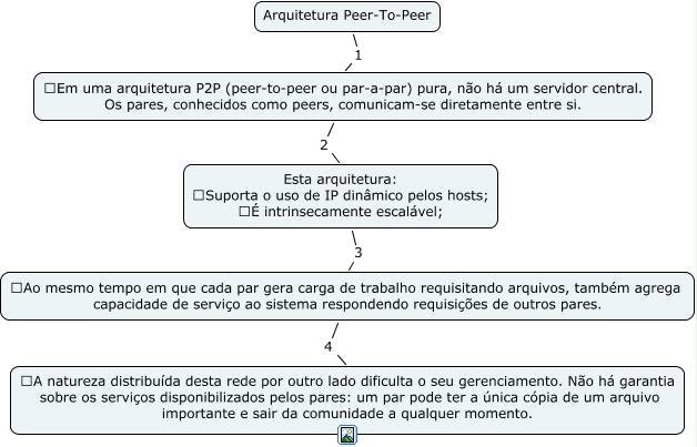 Esse mapa conceitual, produzido no IHMC CmapTools, tem a informação relacionada a: Arquitetura Peer_To_Peer, Ao mesmo tempo em que cada par gera carga de trabalho requisitando arquivos, também agrega capacidade de serviço ao sistema respondendo requisições de outros pares. 4 A natureza distribuída desta rede por outro lado dificulta o seu gerenciamento. Não há garantia sobre os serviços disponibilizados pelos pares: um par pode ter a única cópia de um arquivo importante e sair da comunidade a qualquer momento., Esta arquitetura: Suporta o uso de IP dinâmico pelos hosts; É intrinsecamente escalável; 3 Ao mesmo tempo em que cada par gera carga de trabalho requisitando arquivos, também agrega capacidade de serviço ao sistema respondendo requisições de outros pares., Arquitetura Peer-To-Peer 1 Em uma arquitetura P2P (peer-to-peer ou par-a-par) pura, não há um servidor central. Os pares, conhecidos como peers, comunicam-se diretamente entre si., Em uma arquitetura P2P (peer-to-peer ou par-a-par) pura, não há um servidor central. Os pares, conhecidos como peers, comunicam-se diretamente entre si. 2 Esta arquitetura: Suporta o uso de IP dinâmico pelos hosts; É intrinsecamente escalável;