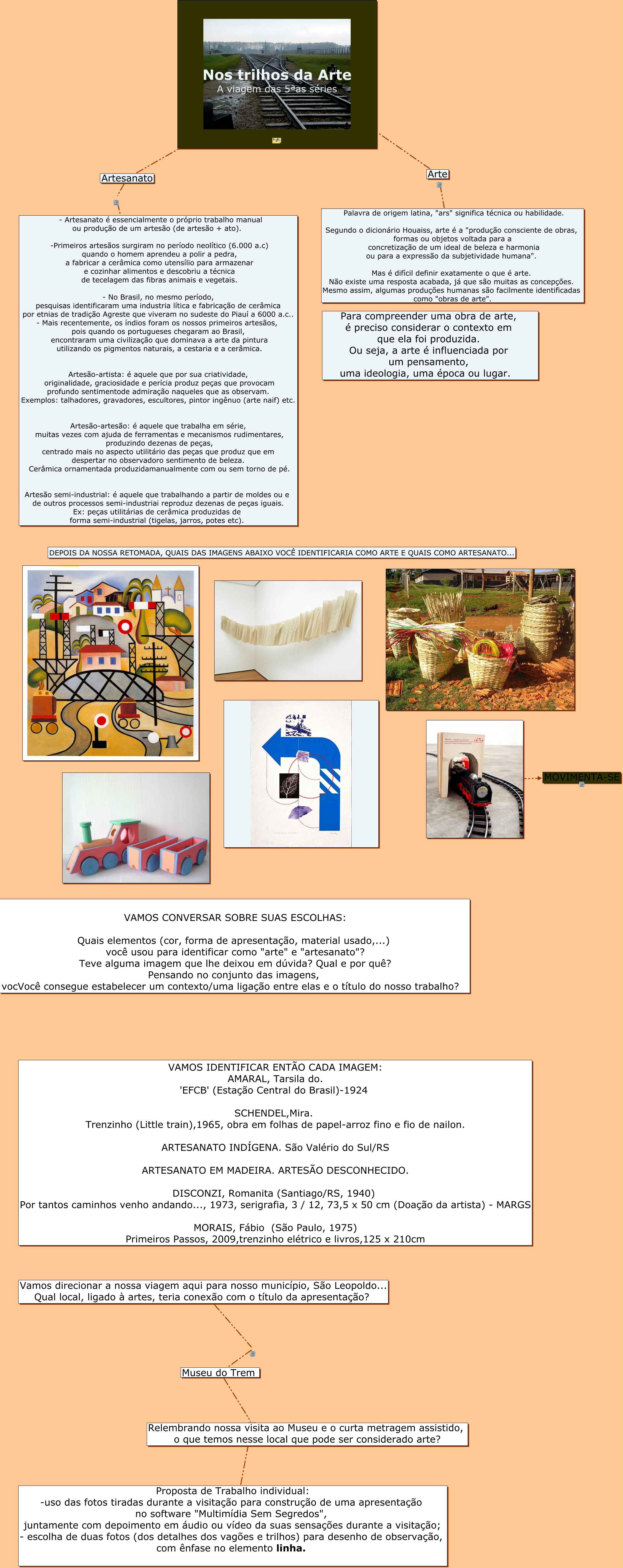 Esse mapa conceitual, produzido no IHMC CmapTools, tem a informação relacionada a: OBJETO DE APRENDIZAGEM, ???? MOVIMENTA-SE, Artesanato ???? Nos trilhos da Arte A viagem das 5ªas séries, Arte Palavra de origem latina, "ars" significa técnica ou habilidade. Segundo o dicionário Houaiss, arte é a "produção consciente de obras, formas ou objetos voltada para a concretização de um ideal de beleza e harmonia ou para a expressão da subjetividade humana". Mas é difícil definir exatamente o que é arte. Não existe uma resposta acabada, já que são muitas as concepções. Mesmo assim, algumas produções humanas são facilmente identificadas como "obras de arte"., Museu do Trem ???? Relembrando nossa visita ao Museu e o curta metragem assistido, o que temos nesse local que pode ser considerado arte?, Vamos direcionar a nossa viagem aqui para nosso município, São Leopoldo... Qual local, ligado à artes, teria conexão com o título da apresentação? Museu do Trem, Artesanato - Artesanato é essencialmente o próprio trabalho manual ou produção de um artesão (de artesão + ato). -Primeiros artesãos surgiram no período neolítico (6.000 a.c) quando o homem aprendeu a polir a pedra, a fabricar a cerâmica como utensílio para armazenar e cozinhar alimentos e descobriu a técnica de tecelagem das fibras animais e vegetais. - No Brasil, no mesmo período, pesquisas identificaram uma industria lítica e fabricação de cerâmica por etnias de tradição Agreste que viveram no sudeste do Piauí a 6000 a.c.. - Mais recentemente, os índios foram os nossos primeiros artesãos, pois quando os portugueses chegaram ao Brasil, encontraram uma civilização que dominava a arte da pintura utilizando os pigmentos naturais, a cestaria e a cerâmica. Artesão-artista: é aquele que por sua criatividade, originalidade, graciosidade e perícia produz peças que provocam profundo sentimentode admiração naqueles que as observam. Exemplos: talhadores, gravadores, escultores, pintor ingênuo (arte naif) etc. Artesão-artesão: é aquele que trabalha em série, muitas vezes com ajuda de ferramentas e mecanismos rudimentares, produzindo dezenas de peças, centrado mais no aspecto utilitário das peças que produz que em despertar no observadoro sentimento de beleza. Cerâmica ornamentada produzidamanualmente com ou sem torno de pé. Artesão semi-industrial: é aquele que trabalhando a partir de moldes ou e de outros processos semi-industriai reproduz dezenas de peças iguais. Ex: peças utilitárias de cerâmica produzidas de forma semi-industrial (tigelas, jarros, potes etc)., Relembrando nossa visita ao Museu e o curta metragem assistido, o que temos nesse local que pode ser considerado arte? ???? Proposta de Trabalho individual: -uso das fotos tiradas durante a visitação para construção de uma apresentação no software "Multimídia Sem Segredos", juntamente com depoimento em áudio ou vídeo da suas sensações durante a visitação; - escolha de duas fotos (dos detalhes dos vagões e trilhos) para desenho de observação, com ênfase no elemento linha., Arte ???? Nos trilhos da Arte A viagem das 5ªas séries