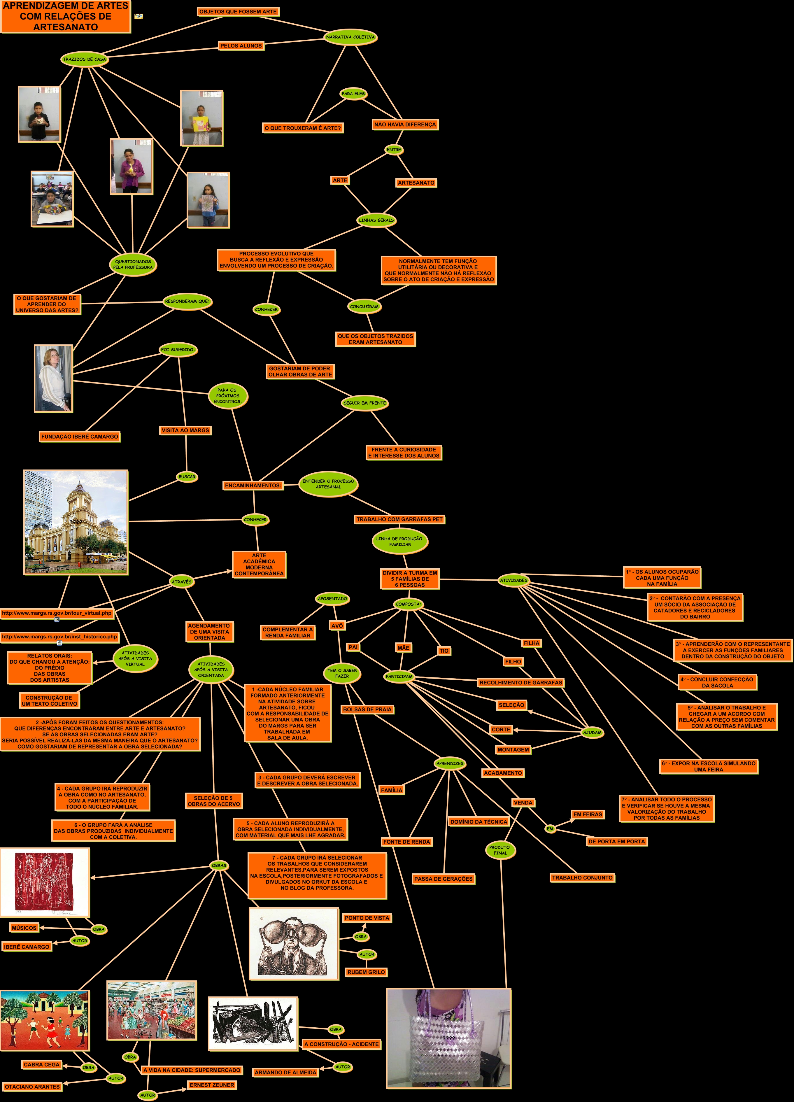 Esse mapa conceitual, produzido no IHMC CmapTools, tem a informação relacionada a: APRENDIZAGEM DE ARTE COM RELAÇÕES DE ARTESANATO, BOLSAS DE PRAIA APRENDIZES TRABALHO CONJUNTO, AVÔ TEM O SABER FAZER BOLSAS DE PRAIA, ARTE ACADÊMICA MODERNA CONTEMPORÂNEA ATRAVÉS AGENDAMENTO DE UMA VISITA ORIENTADA, FILHA AJUDAM SELEÇÃO, MÃE PARTICIPAM CORTE, FILHO COMPOSTA: AVÔ, QUESTIONADOS PELA PROFESSORA O QUE GOSTARIAM DE APRENDER DO UNIVERSO DAS ARTES?, NÃO HAVIA DIFERENÇA ENTRE ARTESANATO, ???? ATRAVÉS AGENDAMENTO DE UMA VISITA ORIENTADA, RECOLHIMENTO DE GARRAFAS PARTICIPAM CORTE, O QUE GOSTARIAM DE APRENDER DO UNIVERSO DAS ARTES? RESPONDERAM QUE: GOSTARIAM DE PODER OLHAR OBRAS DE ARTE, AGENDAMENTO DE UMA VISITA ORIENTADA ATIVIDADES APÓS A VISITA ORIENTADA 2 -APÓS FORAM FEITOS OS QUESTIONAMENTOS: QUE DIFERENÇAS ENCONTRARAM ENTRE ARTE E ARTESANATO? SE AS OBRAS SELECIONADAS ERAM ARTE? SERIA POSS�?VEL REALIZ�?-LAS DA MESMA MANEIRA QUE O ARTESANATO? COMO GOSTARIAM DE REPRESENTAR A OBRA SELECIONADA?, AGENDAMENTO DE UMA VISITA ORIENTADA ATIVIDADES APÓS A VISITA ORIENTADA 1 -CADA NÚCLEO FAMILIAR FORMADO ANTERIORMENTE NA ATIVIDADE SOBRE ARTESANATO, FICOU COM A RESPONSABILIDADE DE SELECIONAR UMA OBRA DO MARGS PARA SER TRABALHADA EM SALA DE AULA., OBRAS, ARTE LINHAS GERAIS NORMALMENTE TEM FUNÇÃO UTILIT�?RIA OU DECORATIVA E QUE NORMALMENTE NÃO H�? REFLEXÃO SOBRE O ATO DE CRIAÇÃO E EXPRESSÃO, AVÔ APOSENTADO COMPLEMENTAR A RENDA FAMILIAR, PROCESSO EVOLUTIVO QUE BUSCA A REFLEXÃO E EXPRESSÃO ENVOLVENDO UM PROCESSO DE CRIAÇÃO. CONHECER GOSTARIAM DE PODER OLHAR OBRAS DE ARTE, BOLSAS DE PRAIA APRENDIZES FAM�?LIA, DIVIDIR A TURMA EM 5 FAM�?LIAS DE 6 PESSOAS COMPOSTA: AVÔ, PAI PARTICIPAM VENDA