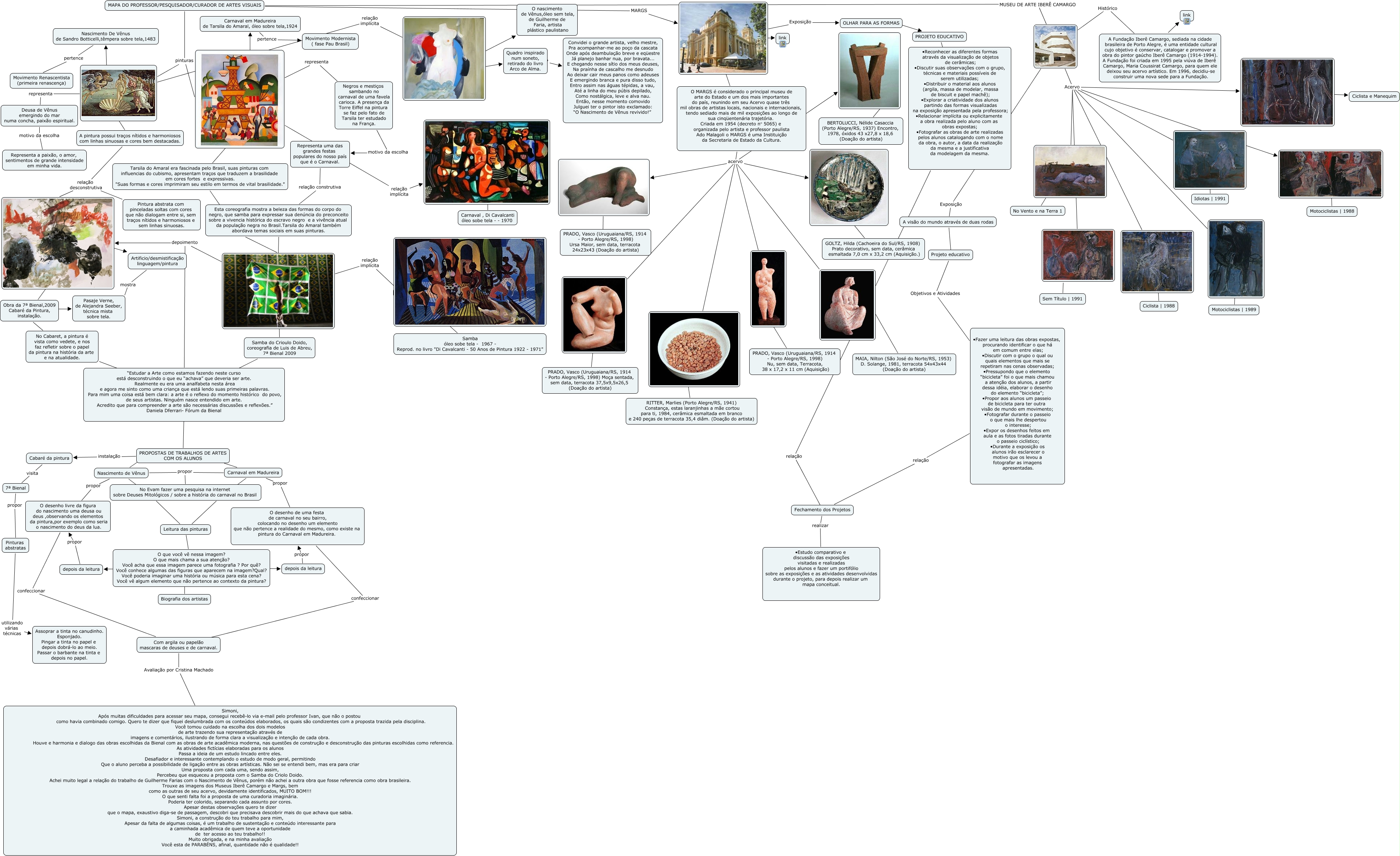 Esse mapa conceitual, produzido no IHMC CmapTools, tem a informação relacionada a: Mapa do professor pesquisador curador de artes visuais, ???? MAIA, Nilton (São José do Norte/RS, 1953) D. Solange, 1981, terracota 54x43x44 (Doação do artista), ???? Motociclistas | 1989, “Estudar a Arte como estamos fazendo neste curso está desconstruindo o que eu “achava�? que deveria ser arte. Realmente eu era uma analfabeta nesta área e agora me sinto como uma criança que está lendo suas primeiras palavras. Para mim uma coisa está bem clara: a arte é o reflexo do momento histórico do povo, de seus artistas. Ninguém nasce entendido em arte. Acredito que para compreender a arte são necessárias discussões e reflexões.�? Daniela Dferrari- Fórum da Bienal depoimento, O desenho livre da figura do nascimento uma deusa ou deus ,observando os elementos da pintura,por exemplo como seria o nascimento do deus da lua. confeccionar Com argila ou papelão mascaras de deuses e de carnaval., O MARGS é considerado o principal museu de arte do Estado e um dos mais importantes do país, reunindo em seu Acervo quase três mil obras de artistas locais, nacionais e internacionais, tendo sediado mais de mil exposições ao longo de sua cinqüentenária trajetória. Criada em 1954 (decreto n° 5065) e organizada pelo artista e professor paulista Ado Malagoli o MARGS é uma Instituição da Secretaria de Estado da Cultura. acervo, Acervo, ???? link, PROPOSTAS DE TRABALHOS DE ARTES COM OS ALUNOS instalação Cabaré da pintura, OLHAR PARA AS FORMAS ???? PROJETO EDUCATIVO, representa Deusa de Vênus emergindo do mar numa concha, paixão espiritual., 7ª Bienal propor Pinturas abstratas, Projeto educativo Objetivos e Atividades • Fazer uma leitura das obras expostas, procurando identificar o que há em comum entre elas; • Discutir com o grupo o qual ou quais elementos que mais se repetiram nas cenas observadas; • Pressupondo que o elemento “bicicleta�? foi o que mais chamou a atenção dos alunos, a partir dessa idéia, elaborar o desenho do elemento “bicicleta�?; • Propor aos alunos um passeio de bicicleta para ter outra visão de mundo em movimento; • Fotografar durante o passeio o que mais lhe despertou o interesse; • Expor os desenhos feitos em aula e as fotos tiradas durante o passeio ciclístico; • Durante a exposição os alunos irão esclarecer o motivo que os levou a fotografar as imagens apresentadas., “Estudar a Arte como estamos fazendo neste curso está desconstruindo o que eu “achava�? que deveria ser arte. Realmente eu era uma analfabeta nesta área e agora me sinto como uma criança que está lendo suas primeiras palavras. Para mim uma coisa está bem clara: a arte é o reflexo do momento histórico do povo, de seus artistas. Ninguém nasce entendido em arte. Acredito que para compreender a arte são necessárias discussões e reflexões.�? Daniela Dferrari- Fórum da Bienal depoimento, PROPOSTAS DE TRABALHOS DE ARTES COM OS ALUNOS ???? Nascimento de Vênus, Acervo, Obra da 7ª Bienal,2009 Cabaré da Pintura, instalação. ???? Pasaje Verne, de Alejandra Seeber, técnica mista sobre tela., ???? Ciclista e Manequim, ???? O MARGS é considerado o principal museu de arte do Estado e um dos mais importantes do país, reunindo em seu Acervo quase três mil obras de artistas locais, nacionais e internacionais, tendo sediado mais de mil exposições ao longo de sua cinqüentenária trajetória. Criada em 1954 (decreto n° 5065) e organizada pelo artista e professor paulista Ado Malagoli o MARGS é uma Instituição da Secretaria de Estado da Cultura., Nascimento de Vênus ???? Leitura das pinturas, Leitura das pinturas ???? O que você vê nessa imagem? O que mais chama a sua atenção? Você acha que essa imagem parece uma fotografia ? Por quê? Você conhece algumas das figuras que aparecem na imagem?Qual? Você poderia imaginar uma história ou música para esta cena? Você vê algum elemento que não pertence ao contexto da pintura?