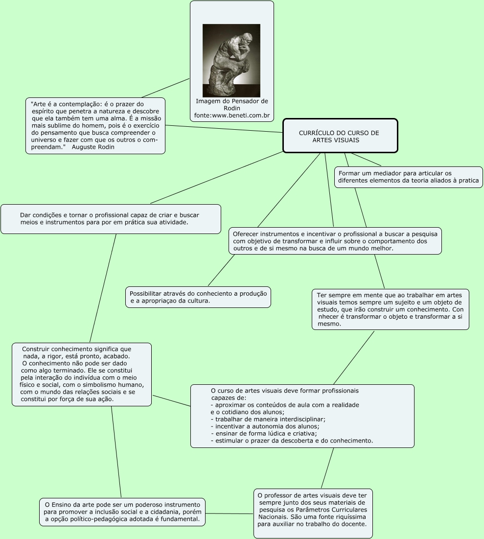 Esse mapa conceitual, produzido no IHMC CmapTools, tem a informação relacionada a: Currículo da graduação em Artes Visuais, O Ensino da arte pode ser um poderoso instrumento para promover a inclusão social e a cidadania, porém a opção político-pedagógica adotada é fundamental. ???? Construir conhecimento significa que nada, a rigor, está pronto, acabado. O conhecimento não pode ser dado como algo terminado. Ele se constitui pela interação do indivídua com o meio físico e social, com o simbolismo humano, com o mundo das relações sociais e se constitui por força de sua ação., O professor de artes visuais deve ter sempre junto dos seus materiais de pesquisa os Parâmetros Curriculares Nacionais. São uma fonte riquíssima para auxiliar no trabalho do docente. ???? O curso de artes visuais deve formar profissionais capazes de: - aproximar os conteúdos de aula com a realidade e o cotidiano dos alunos; - trabalhar de maneira interdisciplinar; - incentivar a autonomia dos alunos; - ensinar de forma lúdica e criativa; - estimular o prazer da descoberta e do conhecimento., Ter sempre em mente que ao trabalhar em artes visuais temos sempre um sujeito e um objeto de estudo, que irão construir um conhecimento. Con nhecer é transformar o objeto e transformar a si mesmo. ???? CURR�?CULO DO CURSO DE ARTES VISUAIS, CURR�?CULO DO CURSO DE ARTES VISUAIS ???? Formar um mediador para articular os diferentes elementos da teoria aliados à pratica, Imagem do Pensador de Rodin fonte:www.beneti.com.br ???? "Arte é a contemplação: é o prazer do espírito que penetra a natureza e descobre que ela também tem uma alma. É a missão mais sublime do homem, pois é o exercício do pensamento que busca compreender o universo e fazer com que os outros o com- preendam." Auguste Rodin, Construir conhecimento significa que nada, a rigor, está pronto, acabado. O conhecimento não pode ser dado como algo terminado. Ele se constitui pela interação do indivídua com o meio físico e social, com o simbolismo humano, com o mundo das relações sociais e se constitui por força de sua ação. ???? Dar condições e tornar o profissional capaz de criar e buscar meios e instrumentos para por em prática sua atividade., CURR�?CULO DO CURSO DE ARTES VISUAIS ???? Oferecer instrumentos e incentivar o profissional a buscar a pesquisa com objetivo de transformar e influir sobre o comportamento dos outros e de si mesmo na busca de um mundo melhor., Dar condições e tornar o profissional capaz de criar e buscar meios e instrumentos para por em prática sua atividade. ???? CURR�?CULO DO CURSO DE ARTES VISUAIS, Possibilitar através do conheciento a produção e a apropriaçao da cultura. ???? CURR�?CULO DO CURSO DE ARTES VISUAIS, CURR�?CULO DO CURSO DE ARTES VISUAIS ???? "Arte é a contemplação: é o prazer do espírito que penetra a natureza e descobre que ela também tem uma alma. É a missão mais sublime do homem, pois é o exercício do pensamento que busca compreender o universo e fazer com que os outros o com- preendam." Auguste Rodin, Construir conhecimento significa que nada, a rigor, está pronto, acabado. O conhecimento não pode ser dado como algo terminado. Ele se constitui pela interação do indivídua com o meio físico e social, com o simbolismo humano, com o mundo das relações sociais e se constitui por força de sua ação. ???? O curso de artes visuais deve formar profissionais capazes de: - aproximar os conteúdos de aula com a realidade e o cotidiano dos alunos; - trabalhar de maneira interdisciplinar; - incentivar a autonomia dos alunos; - ensinar de forma lúdica e criativa; - estimular o prazer da descoberta e do conhecimento., Ter sempre em mente que ao trabalhar em artes visuais temos sempre um sujeito e um objeto de estudo, que irão construir um conhecimento. Con nhecer é transformar o objeto e transformar a si mesmo. ???? O curso de artes visuais deve formar profissionais capazes de: - aproximar os conteúdos de aula com a realidade e o cotidiano dos alunos; - trabalhar de maneira interdisciplinar; - incentivar a autonomia dos alunos; - ensinar de forma lúdica e criativa; - estimular o prazer da descoberta e do conhecimento., O professor de artes visuais deve ter sempre junto dos seus materiais de pesquisa os Parâmetros Curriculares Nacionais. São uma fonte riquíssima para auxiliar no trabalho do docente. ???? O Ensino da arte pode ser um poderoso instrumento para promover a inclusão social e a cidadania, porém a opção político-pedagógica adotada é fundamental.
