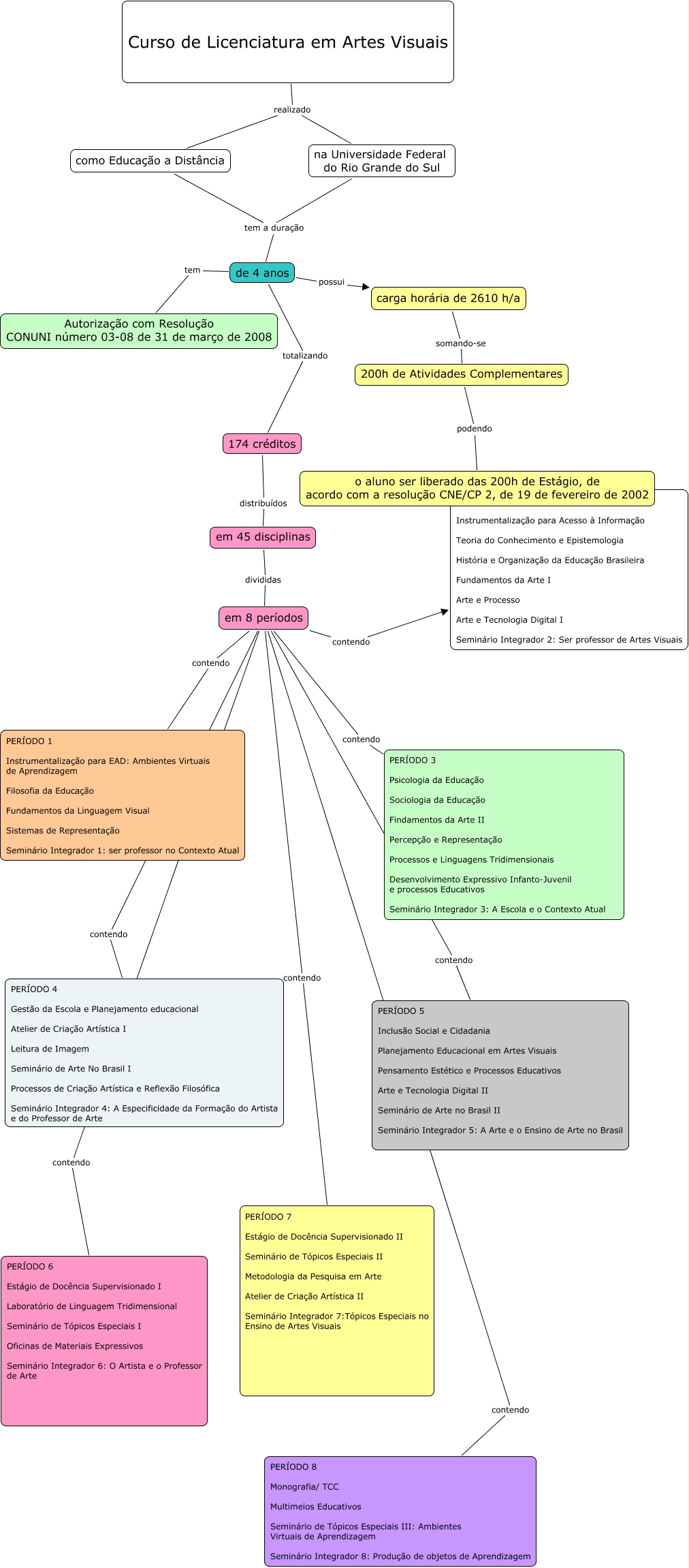 Esse mapa conceitual, produzido no IHMC CmapTools, tem a informação relacionada a: Currículo de Artes Visuais 1, Curso de Licenciatura em Artes Visuais realizado na Universidade Federal do Rio Grande do Sul, em 45 disciplinas divididas em 8 períodos, em 8 períodos contendo PER�?ODO 4 Gestão da Escola e Planejamento educacional Atelier de Criação Artística I Leitura de Imagem Seminário de Arte No Brasil I Processos de Criação Artística e Reflexão Filosófica Seminário Integrador 4: A Especificidade da Formação do Artista e do Professor de Arte, 174 créditos distribuídos em 45 disciplinas, carga horária de 2610 h/a somando-se 200h de Atividades Complementares, em 8 períodos contendo PER�?ODO 6 Estágio de Docência Supervisionado I Laboratório de Linguagem Tridimensional Seminário de Tópicos Especiais I Oficinas de Materiais Expressivos Seminário Integrador 6: O Artista e o Professor de Arte, Curso de Licenciatura em Artes Visuais realizado como Educação a Distância, em 8 períodos contendo PER�?ODO 3 Psicologia da Educação Sociologia da Educação Findamentos da Arte II Percepção e Representação Processos e Linguagens Tridimensionais Desenvolvimento Expressivo Infanto-Juvenil e processos Educativos Seminário Integrador 3: A Escola e o Contexto Atual, de 4 anos tem Autorização com Resolução CONUNI número 03-08 de 31 de março de 2008, 200h de Atividades Complementares podendo o aluno ser liberado das 200h de Estágio, de acordo com a resolução CNE/CP 2, de 19 de fevereiro de 2002, na Universidade Federal do Rio Grande do Sul tem a duração de 4 anos, em 8 períodos contendo PER�?ODO 1 Instrumentalização para EAD: Ambientes Virtuais de Aprendizagem Filosofia da Educação Fundamentos da Linguagem Visual Sistemas de Representação Seminário Integrador 1: ser professor no Contexto Atual, de 4 anos totalizando 174 créditos, em 8 períodos contendo PER�?ODO 5 Inclusão Social e Cidadania Planejamento Educacional em Artes Visuais Pensamento Estético e Processos Educativos Arte e Tecnologia Digital II Seminário de Arte no Brasil II Seminário Integrador 5: A Arte e o Ensino de Arte no Brasil, em 8 períodos contendo PER�?ODO 2 Instrumentalização para Acesso à Informação Teoria do Conhecimento e Epistemologia História e Organização da Educação Brasileira Fundamentos da Arte I Arte e Processo Arte e Tecnologia Digital I Seminário Integrador 2: Ser professor de Artes Visuais, de 4 anos possui carga horária de 2610 h/a, como Educação a Distância tem a duração de 4 anos, em 8 períodos contendo PER�?ODO 7 Estágio de Docência Supervisionado II Seminário de Tópicos Especiais II Metodologia da Pesquisa em Arte Atelier de Criação Artística II Seminário Integrador 7:Tópicos Especiais no Ensino de Artes Visuais, em 8 períodos contendo PER�?ODO 8 Monografia/ TCC Multimeios Educativos Seminário de Tópicos Especiais III: Ambientes Virtuais de Aprendizagem Seminário Integrador 8: Produção de objetos de Aprendizagem