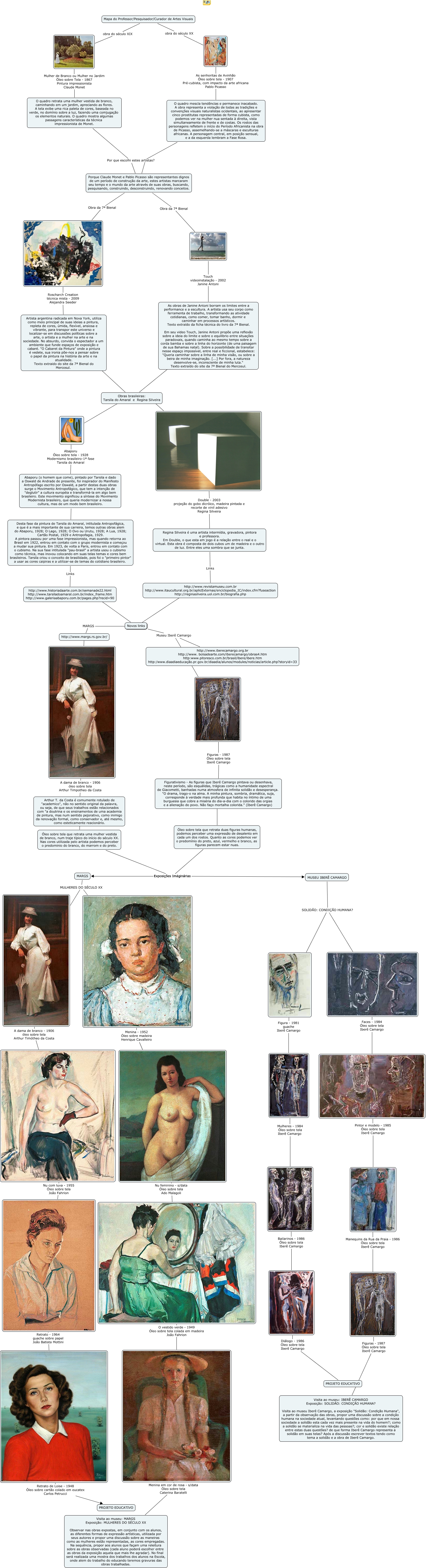 Esse mapa conceitual, produzido no IHMC CmapTools, tem a informação relacionada a: Mapa do professor-pesquisador-curador de artes viauais, http://www.margs.rs.gov.br/ ????, Bailarinos - 1986 Óleo sobre tela Iberê Camargo, Desta fase da pintura de Tarsila do Amaral, intitulada Antropofágica, e que é a mais importante de sua carreira, temos outras obras alem do Abaporu, 1928; O Lago, 1928; O Ovo ou Urutu, 1928; A Lua, 1928; Cartão Postal, 1929 e Antropofagia, 1929. A pintora passou por uma fase impressionista, mas quando retorna ao Brasil em 1922, entrou em contato com o grupo modernista e começou a mudar sua pintura. Em 1923, de volta a Paris, entrou em contato com o cubismo. Na sua fase intitulada "pau-brasil" a artista usou o cubismo como técnica, mas inovou colocando em suas telas temas e cores bem brasileiros. Tarsila criou o conceito de brasilidade, pois foi o "primeiro pintor" a usar as cores caipiras e a utilizar-se de temas do cotidiano brasileiro. Links http://www.historiadaarte.com.br/semanade22.html http://www.tarsiladoamaral.com.br/index_frame.htm http://www.galeriaabaporu.com.br/pages.php?recid=90, Arthur T. da Costa é comumente rotulado de "academico", não no sentido original da palavra, ou seja, de que seus trabalhos estão relacionados com "a doutrina e os ensinamentos de uma academia de pintura, mas num sentido pejorativo, como inimigo da renovação formal, como conservador e, até mesmo, como esteticamente reacionário. ???? Óleo sobre tela que retrata uma mulher vestida de branco, num traje típico do início do século XX. Nas cores utilizada pelo artista podemos perceber o predominio do branco, do marrom e do preto., Figurativismo - As figuras que Iberê Camargo pintava ou desenhava, neste período, são esquálidas, trágicas como a humanidade espectral de Giacometti, banhadas numa atmosfera de infinita solidão e desesperança. "O drama, trago-o na alma. A minha pintura, sombria, dramática, suja, corresponde à verdade mais profunda que habita no íntimo de uma burguesia que cobre a miséria do dia-a-dia com o colorido das orgias e a alienação do povo. Não faço mortalha colorida." (Iberê Camargo) ???? Óleo sobre tela que retrata duas figuras humanas, podemos perceber uma expressão de desalento em cada um dos rostos. Quanto as cores podemos ver o predomínio do preto, azul, vermelho e branco, as figuras parecem estar nuas., Menina - 1952 Óleo sobre madeira Henrique Cavalleiro, Mulheres - 1984 Óleo sobre tela Iberê Camargo, Faces - 1984 Óleo sobre tela Iberê Camargo, Artista argentina radicada em Nova York, utiliza como meio principal de suas ideias a pintura, repleta de cores, úmida, flexível, ansiosa e vibrante, para transpor este universo e localizar-se em discussões políticas sobre a arte, o artista e a mulher na arte e na sociedade. No absurdo, convida o espectador a um ambiente que funde espaços de exposição e cabaré. "O Cabaret da Pintura" onde a pintura é vedete, sua ironia põe-nos a pensar sobre o papel da pintura na história da arte e na atualidade. Texto extraido do site da 7ª Bienal do Mercosul. ???? Obras brasileiras: Tarsila do Amaral e Regina Silveira, MUSEU IBERÊ CAMARGO SOLIDÃO: CONDIÇÃO HUMANA?, Abaporu (o homem que come), pintado por Tarsila e dado a Oswald de Andrade de presente, foi inspirador do Manifesto Antropófago escrito por Oswald, a partir destas duas obras surge o Movimento Antropofágico, que tem a intenção de "deglutir" a cultura européia e transformá-la em algo bem brasileiro. Este movimento significou a síntese do Movimento Modernista brasileiro, que queria modernizar a nossa cultura, mas de um modo bem brasileiro. ???? Desta fase da pintura de Tarsila do Amaral, intitulada Antropofágica, e que é a mais importante de sua carreira, temos outras obras alem do Abaporu, 1928; O Lago, 1928; O Ovo ou Urutu, 1928; A Lua, 1928; Cartão Postal, 1929 e Antropofagia, 1929. A pintora passou por uma fase impressionista, mas quando retorna ao Brasil em 1922, entrou em contato com o grupo modernista e começou a mudar sua pintura. Em 1923, de volta a Paris, entrou em contato com o cubismo. Na sua fase intitulada "pau-brasil" a artista usou o cubismo como técnica, mas inovou colocando em suas telas temas e cores bem brasileiros. Tarsila criou o conceito de brasilidade, pois foi o "primeiro pintor" a usar as cores caipiras e a utilizar-se de temas do cotidiano brasileiro., O quadro retrata uma mulher vestida de branco, caminhando em um jardim, apreciando as flores. A tela exibe uma rica paleta de cores, baseada no verde, no domínio sobre a luz, fazendo uma comjugação os elementos naturais. O quadro mostra algumas passagens características da técnica impressionista de Monet. Por que escolhi estes artistas? Porque Claude Monet e Pablo Picasso são representantes dignos de um período de construção da arte, estes artistas marcaram seu tempo e o mundo da arte através de suas obras, buscando, pesquisando, construindo, desconstruindo, renovando conceitos., Nu com luva - 1955 Óleo sobre tela João Fahrion, Pintor e modelo - 1985 Óleo sobre tela Iberê Camargo, Figuras - 1987 Óleo sobre tela Iberê Camargo Figurativismo - As figuras que Iberê Camargo pintava ou desenhava, neste período, são esquálidas, trágicas como a humanidade espectral de Giacometti, banhadas numa atmosfera de infinita solidão e desesperança. "O drama, trago-o na alma. A minha pintura, sombria, dramática, suja, corresponde à verdade mais profunda que habita no íntimo de uma burguesia que cobre a miséria do dia-a-dia com o colorido das orgias e a alienação do povo. Não faço mortalha colorida." (Iberê Camargo), Óleo sobre tela que retrata uma mulher vestida de branco, num traje típico do início do século XX. Nas cores utilizada pelo artista podemos perceber o predominio do branco, do marrom e do preto. Exposições Imaginárias MARGS, Nu feminino - s/data Óleo sobre tela Ado Malagoli, MUSEU IBERÊ CAMARGO SOLID