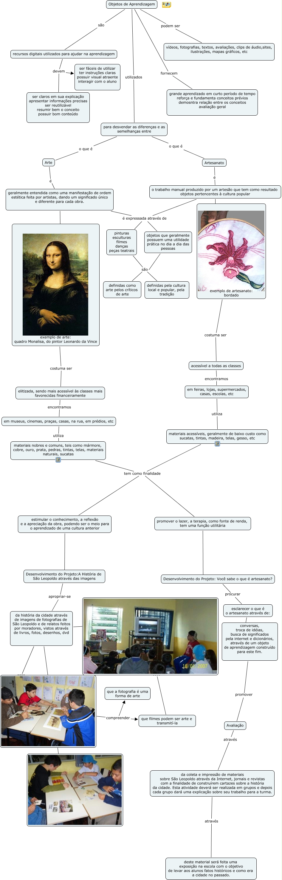 Esse mapa conceitual, produzido no IHMC CmapTools, tem a informação relacionada a: Objetos de Aprendizagem, compreender que filmes podem ser arte e transmití-la, materiais nobres e comuns, teis como mármore, cobre, ouro, prata, pedras, tintas, telas, materiais naturais, sucatas tem como finalidade estimular o conhecimento, a reflexão e a apreciação da obra, podendo ser o meio para o aprendizado de uma cultura anterior, estimular o conhecimento, a reflexão e a apreciação da obra, podendo ser o meio para o aprendizado de uma cultura anterior ???? Desenvolvimento do Projeto:A História de São Leopoldo através das imagens, geralmente entendida como uma manifestação de ordem estética feita por artistas, dando um significado único e diferente para cada obra. é expressada através de pinturas esculturas filmes danças peças teatrais, acessível a todas as classes encontramos em feiras, lojas, supermercados, casas, escolas, etc, para desvendar as diferenças e as semelhanças entre o que é Artesanato, pinturas esculturas filmes danças peças teatrais são definidas pela cultura local e popular, pela tradição, materiais acessíveis, geralmente de baixo custo como sucatas, tintas, madeira, telas, gesso, etc tem como finalidade promover o lazer, a terapia, como fonte de renda, tem uma função utilitária, compreender que a fotografia é uma forma de arte, esclarecer o que é o artesanato através de: conversas, troca de idéias, busca de significados pela internet e dicionários, através de um objeto de aprendizagem construído para este fim., materiais acessíveis, geralmente de baixo custo como sucatas, tintas, madeira, telas, gesso, etc tem como finalidade estimular o conhecimento, a reflexão e a apreciação da obra, podendo ser o meio para o aprendizado de uma cultura anterior, o trabalho manual produzido por um artesão que tem como resultado objetos pertencentes à cultura popular ???? exemplo de artesanato: bordado, da história da cidade através de imagens de fotografias de São Leopoldo e de relatos feitos por moradores, vistos através de livros, fotos, desenhos, dvd ????, pinturas esculturas filmes danças peças teatrais são definidas como arte pelos críticos de arte, recursos digitais utilizados para ajudar na aprendizagem devem ser fáceis de utilizar ter instruções claras possuir visual atraente interagir com o aluno, exemplo de arte: quadro Monalisa, do pintor Leonardo da Vince costuma ser elitizada, sendo mais acessível às classes mais favorecidas financeiramente, materiais nobres e comuns, teis como mármore, cobre, ouro, prata, pedras, tintas, telas, materiais naturais, sucatas tem como finalidade promover o lazer, a terapia, como fonte de renda, tem uma função utilitária, para desvendar as diferenças e as semelhanças entre o que é Arte, recursos digitais utilizados para ajudar na aprendizagem devem ser claros em sua explicação apresentar informações precisas ser reutilizável resumir bem o conceito possuir bom conteúdo, Objetos de Aprendizagem podem ser vídeos, fotografias, textos, avaliações, clips de áudio,sites, ilustrações, mapas gráficos, etc